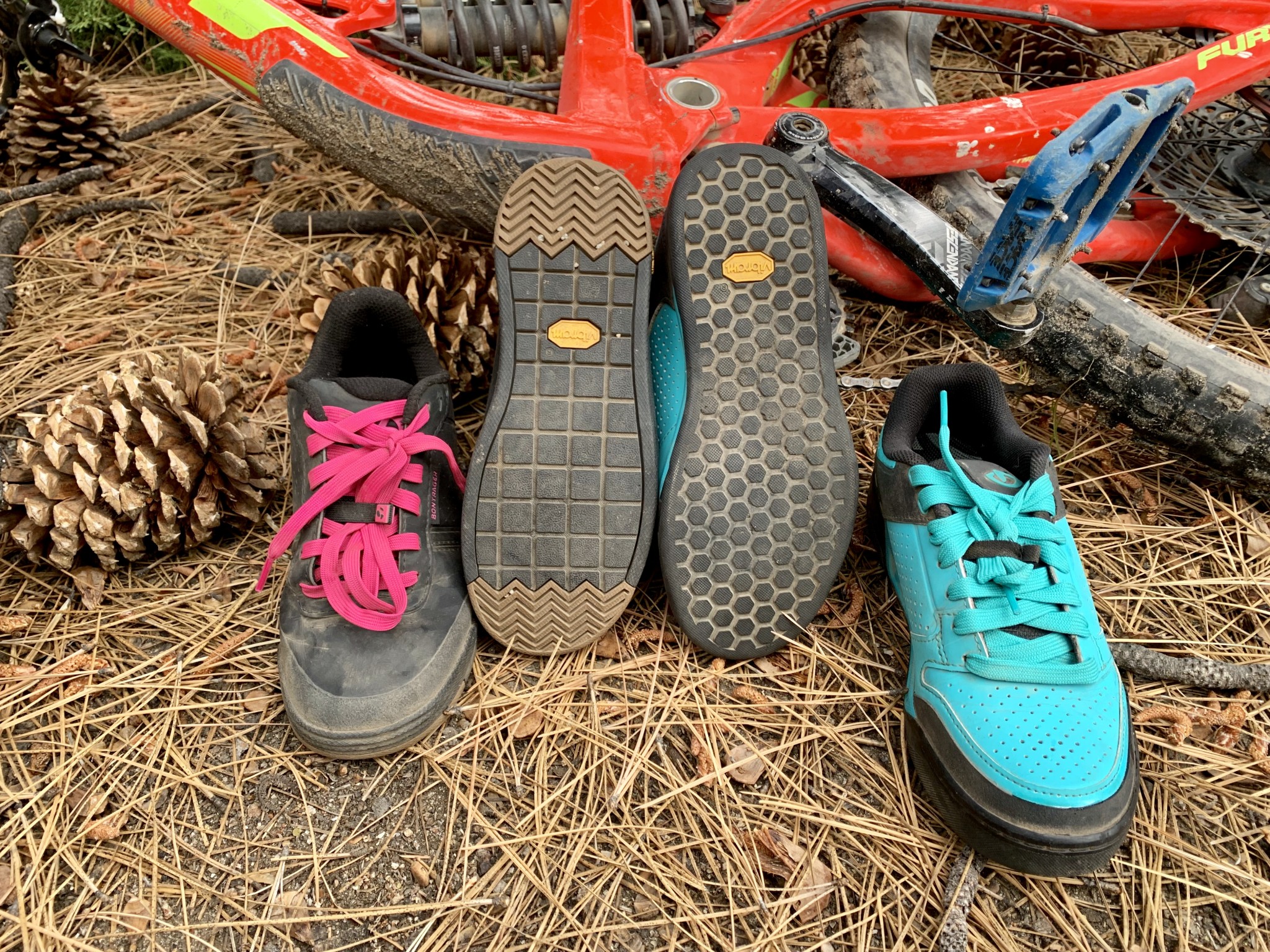 The Flatline has a similar grip to the other shoes we tested with Vibram rubber. We found the grip to be sticky, but still noticed these shoes slipping during technical climbing and when things got bumpy moving downhill. We think the shape of the lugs and the increased surface area with more texture on the Vibram rubber is what makes these shoes an edge. The toe and the heel feature a zig-zag pattern, we feel the variation in pattern helps when you have to take a short hike with your bike. However, when wet, the Flatlines feel slippery on the pedals.