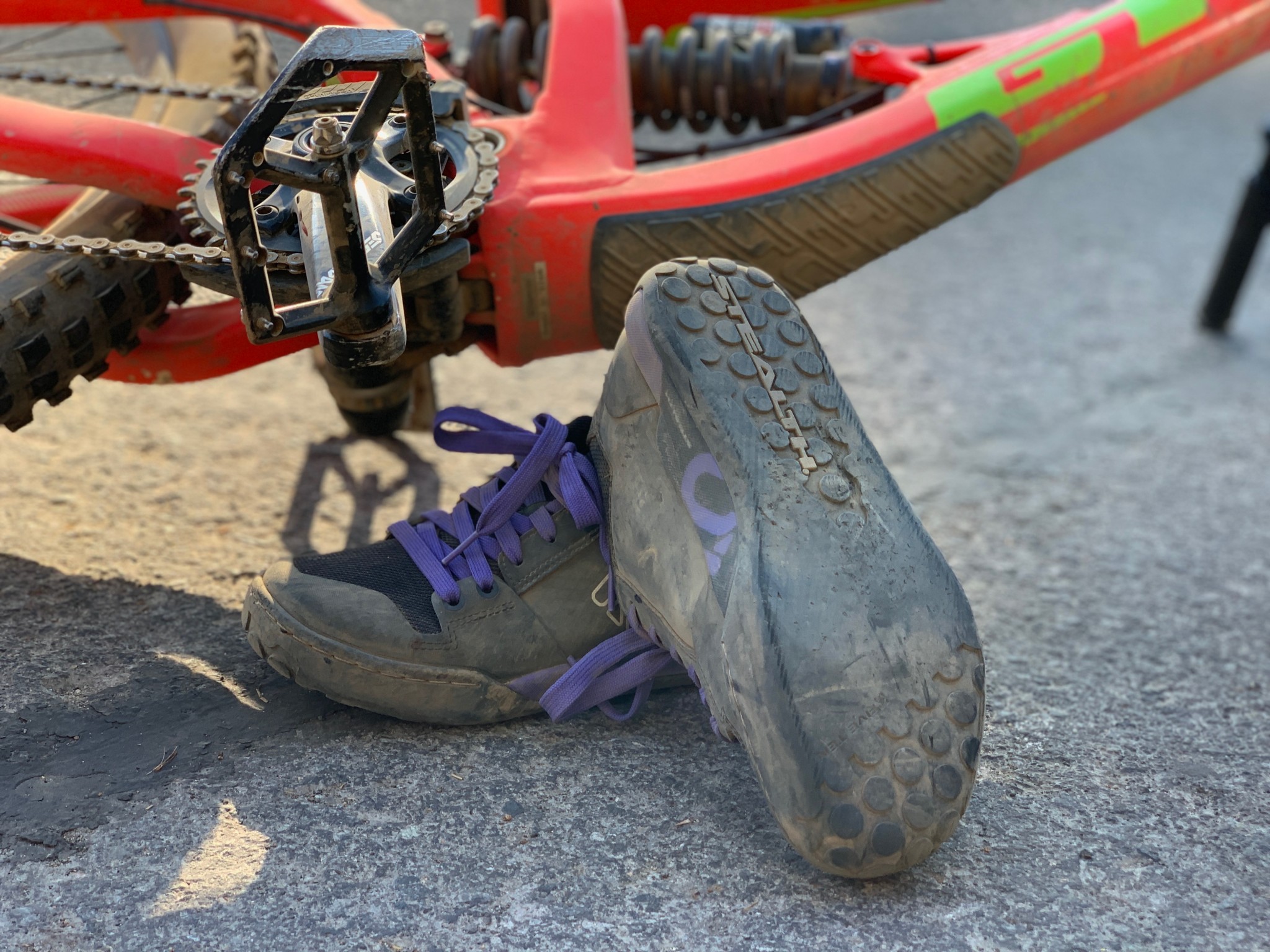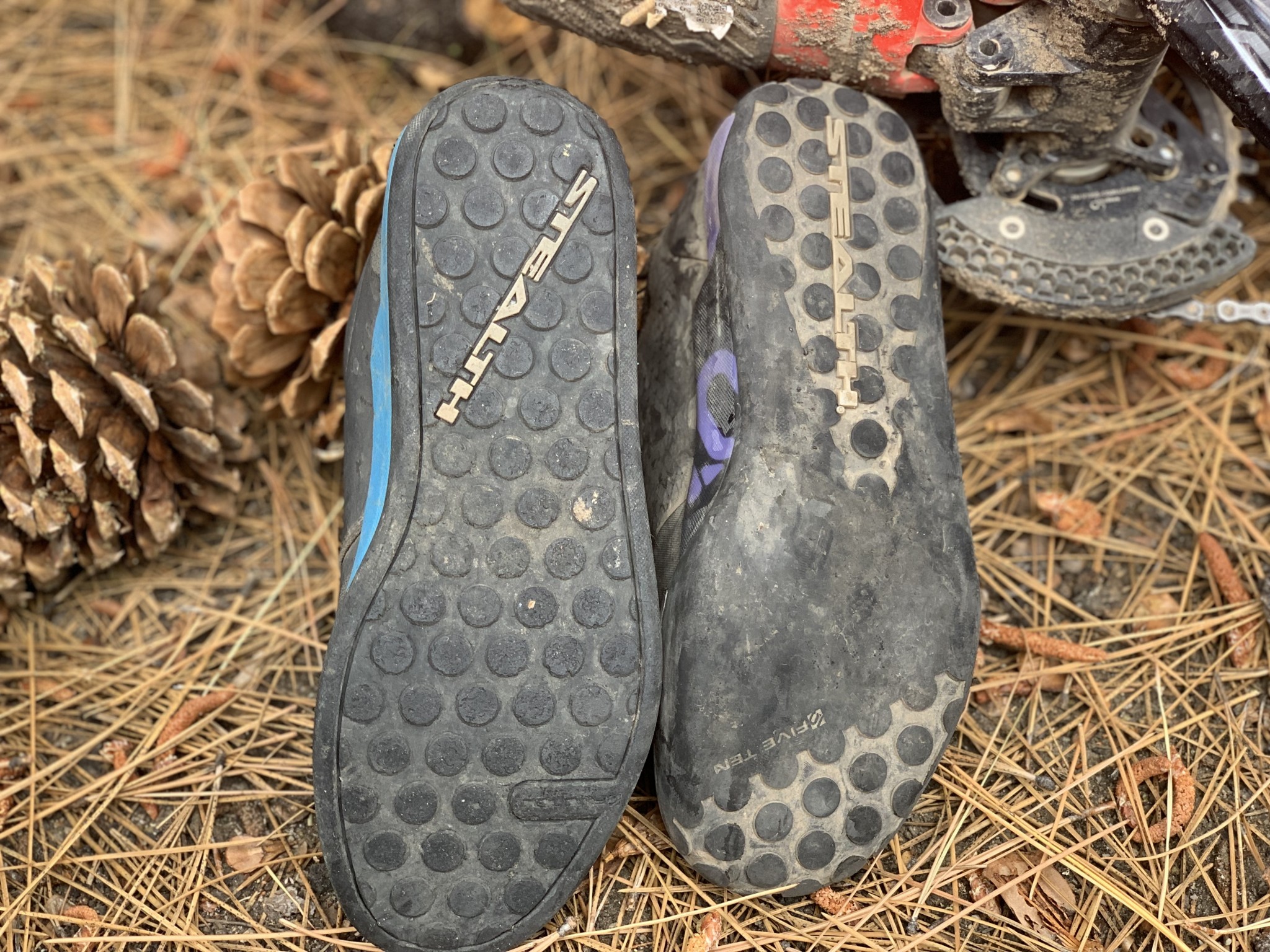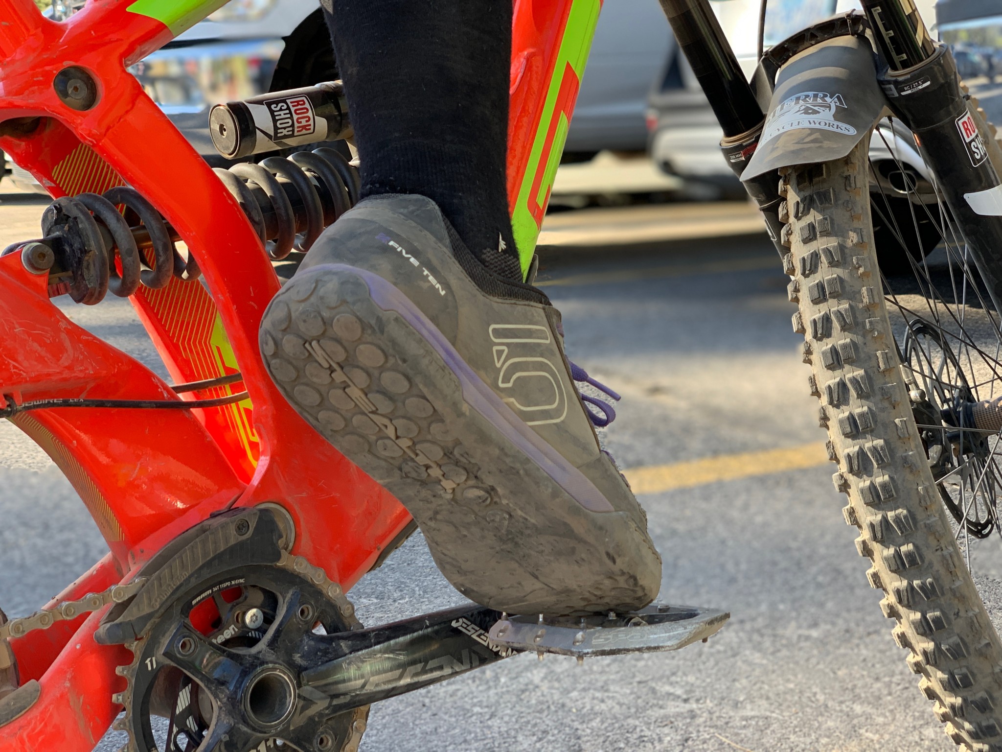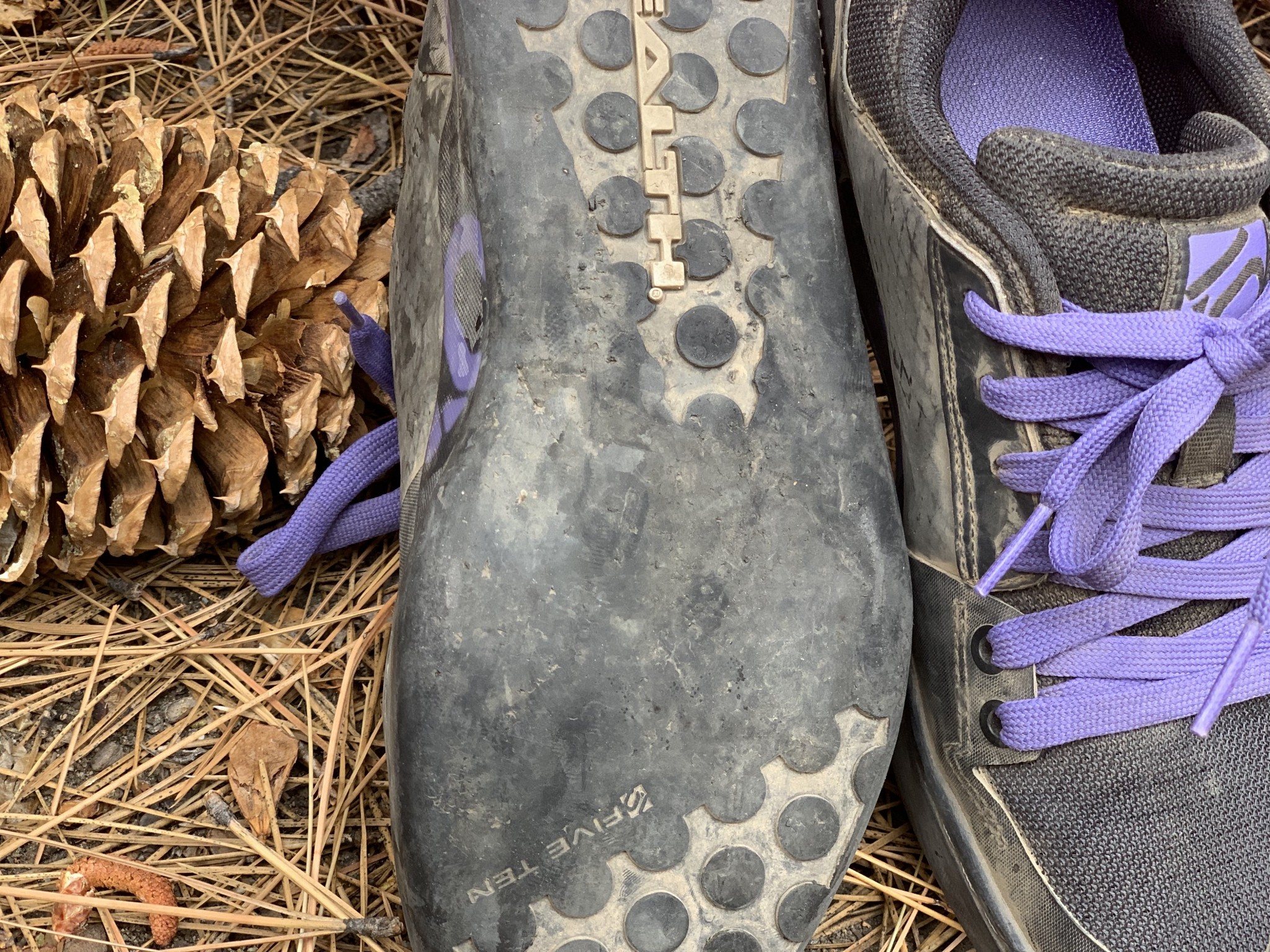 Just like on the other Five Ten shoes we tested, the stealth rubber scarred easily from the pegs on our pedal. Also, the stitching on the front of the shoe started to become frayed only after a few uses. Lastly, the laces are also quite large, and there is no elastic loop to keep them in place, making them an easy target for our chainrings to catch.