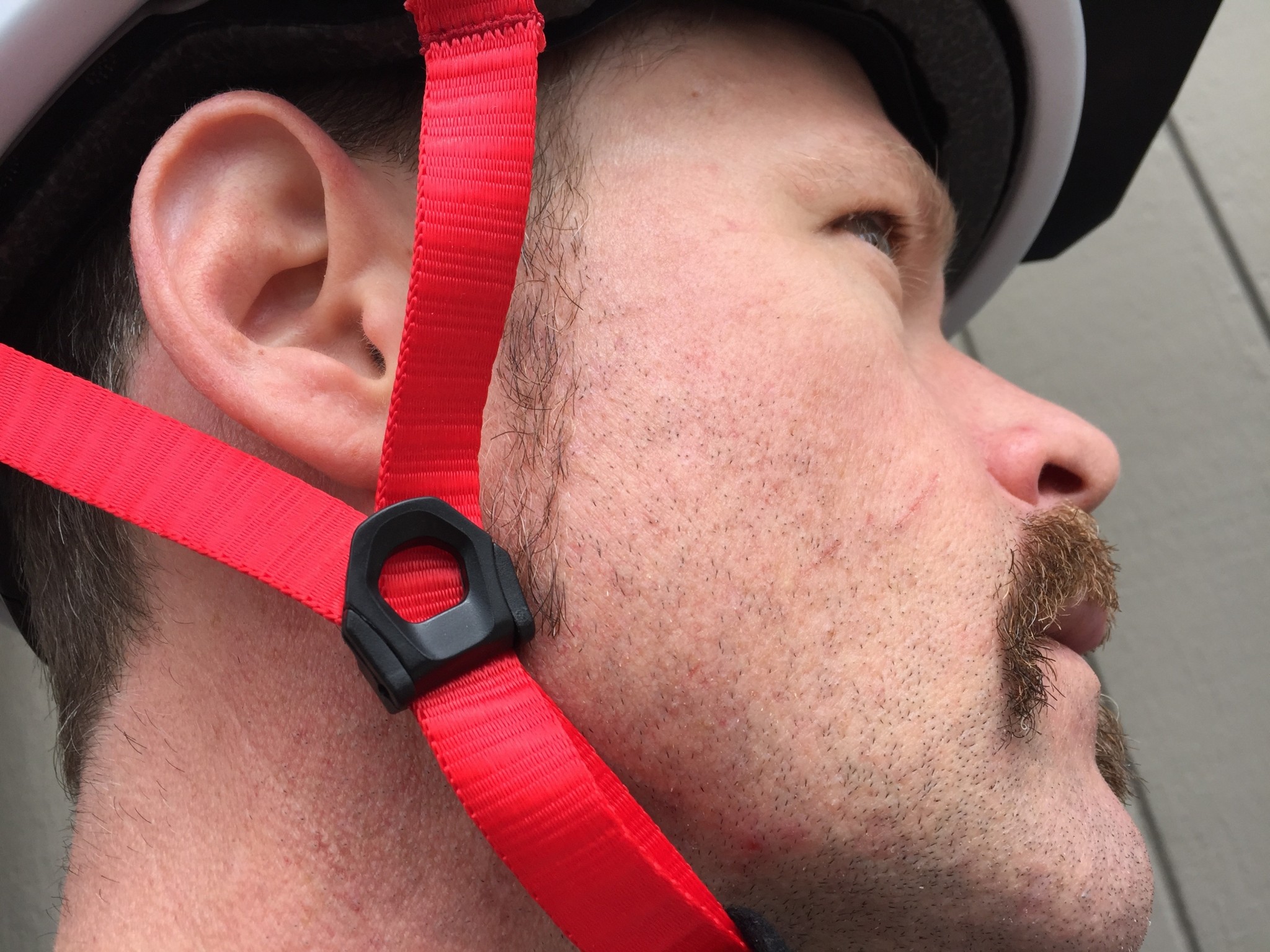 The fit adjustment system is like those found on most other helmets, with a dial that pulls tension evenly from both sides and provides ample adjustment to secure the helmet within each size range. The chin strap is secured with a magnetic Fidlock buckle, and the excess webbing attaches to the helmet under a soft protective wrap. The strap splitter is an adjustable locking V-shape, and you can position them so that they don't make unwanted ear contact.
