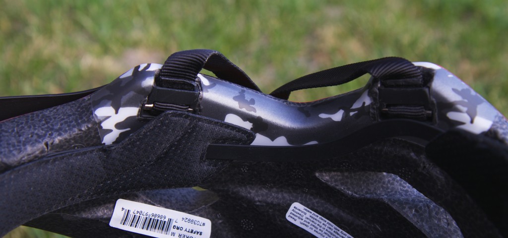 The Stoker uses Bell's Lower Strap Anchor Shell which consists of strips of polycarbonate to protect the polystyrene around the yoke anchor points. While this is better than nothing we prefer helmets with shell material which fully cover the bottom edge of the foam. Credit: Luke Lydiard