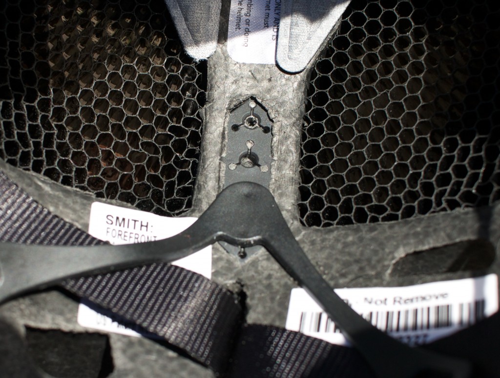 The Forefront uses Smith's Vapor Fit rear retention system. The Vapor Fit system consists of a slim rear retention band and a small click wheel to adjust the tension of the band in small increments. This system reminds us of Giro's RocLoc 5 retention system, though we think the Giro system uses a better click wheel. Tension is released by simply turning the dial the other way rather than pressing the dial vertically like on some Bell Helmets. The rear retention band can also be adjusted vertically into one of three positions using small tabs which click into notches molded into the polystyrene on the inside of the helmet. The harness yoke is adjustable front to back with locking hardware. We've found that locking hardware is a small touch that can make getting going on a ride a bit easier.