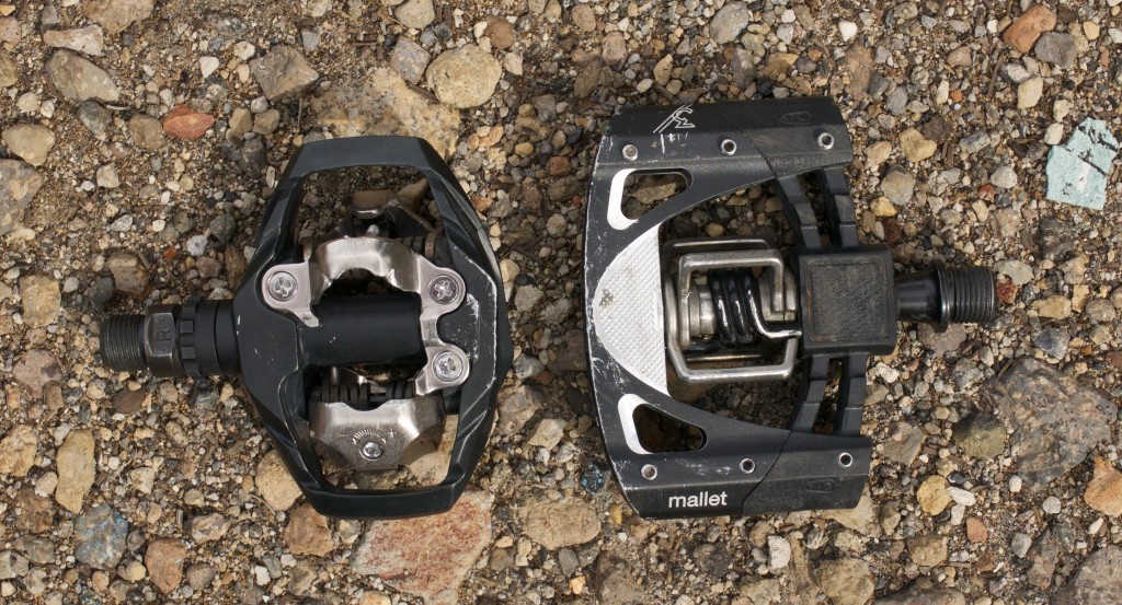 Size comparison between the Shimano M530 (left) and the Crankbrothers Mallet 3 (right). Even though the Mallet 3 is larger, it is actually ligher than the M530. Credit: Luke Lydiard