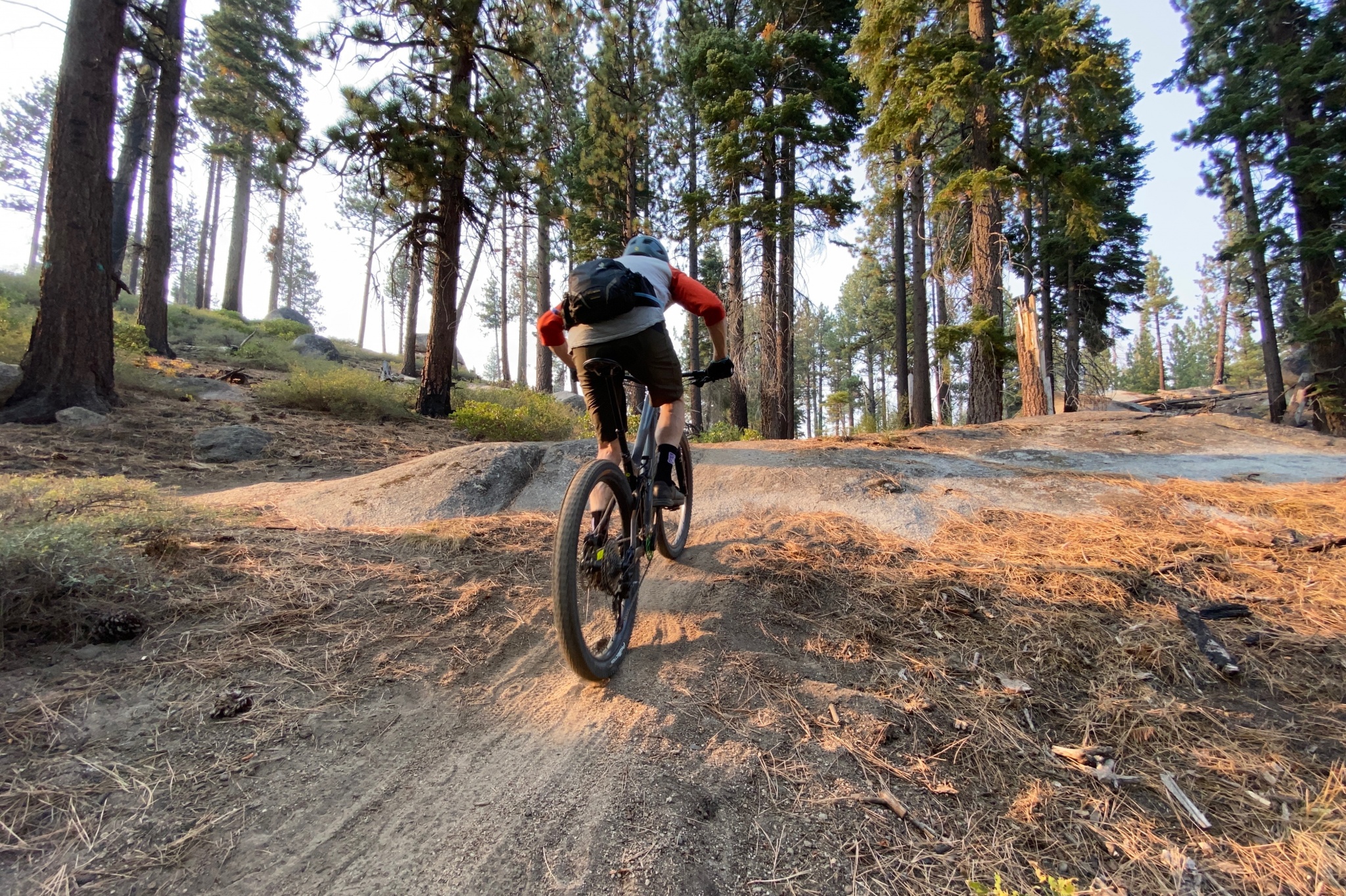 The Der Kaiser is a knobby tire. The side knobs are closely packed, and the center tread consists of alternating rows of relatively tall paddle-shaped lugs. The center tread alternates between two knobs very close together and two a little further apart. All of the center tread knobs are heavily ramped which helps to ease them into the soil. Despite the heavily ramped leading edges, we found the height and sheer number of tread knobs bit well on virtually all surfaces we encountered while climbing. Much of our testing was done in the decomposed granite and sand in the Lake Tahoe Basin in late summer, and we were extremely impressed with the pedal bite this tire delivers. In the saddle or out, these tires hooked up on granite, loose sand, roots, hardpack, you name it.