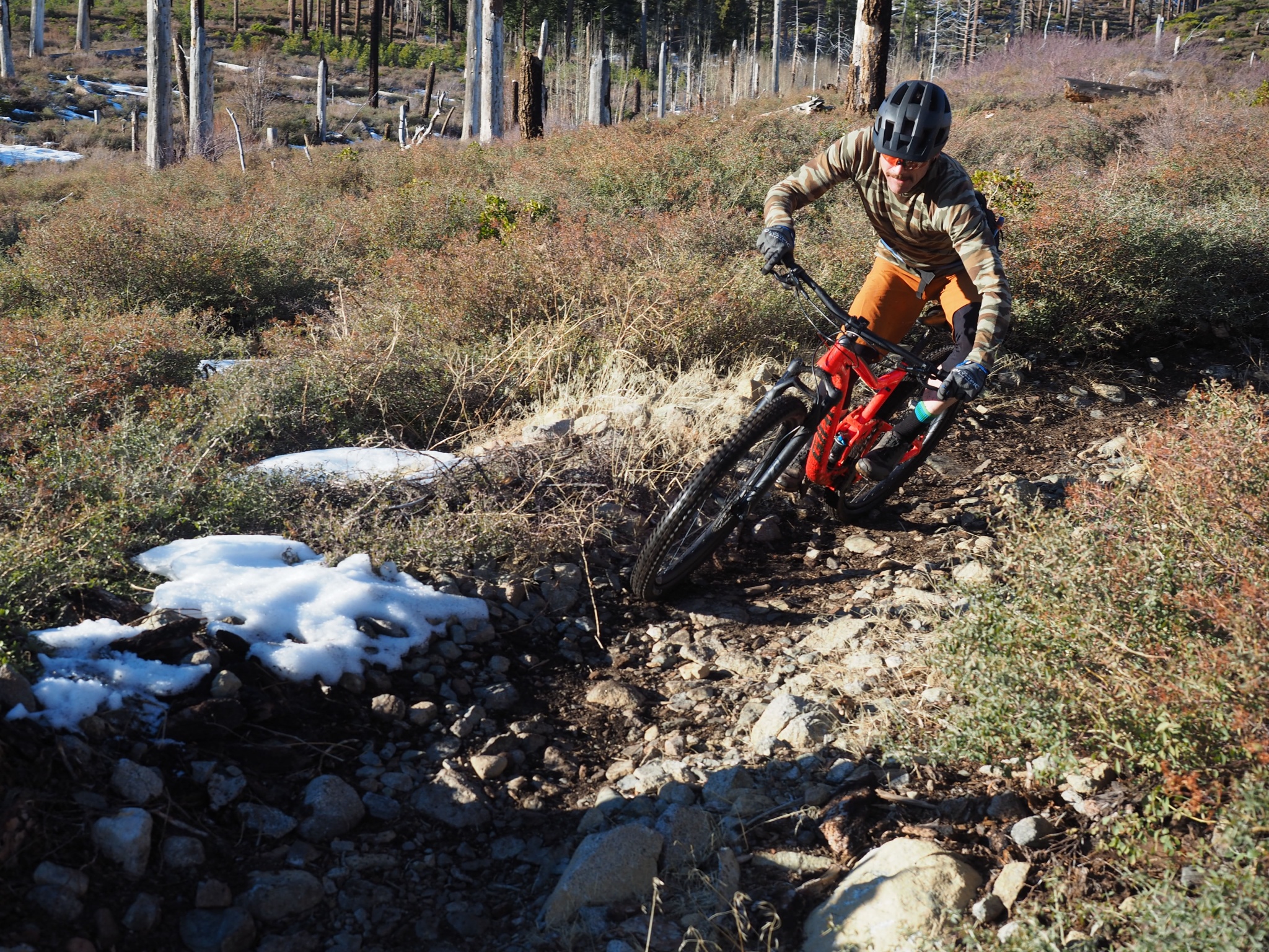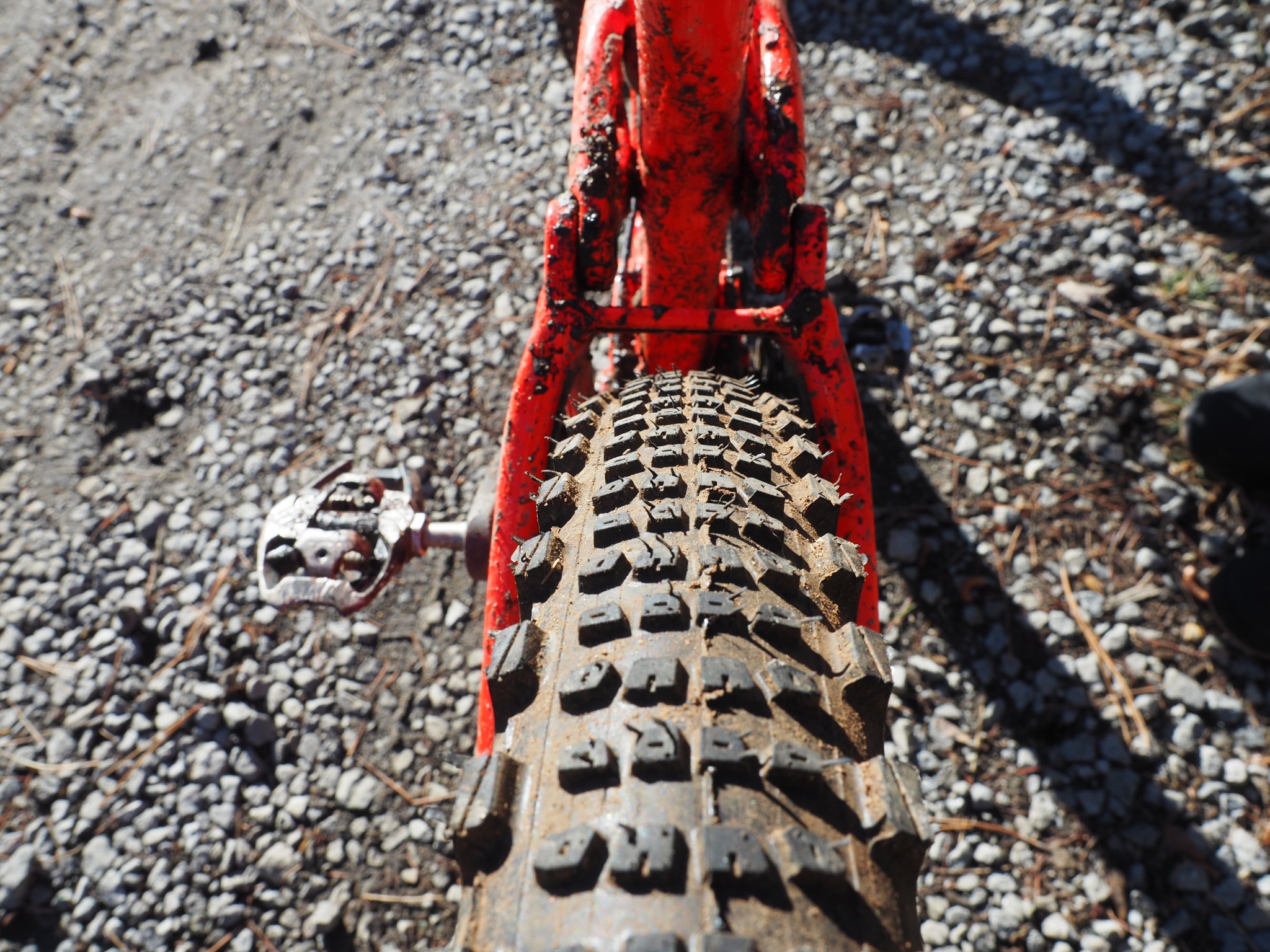 When things get steeper, looser, or wet, it gets a little funky. When you are up and out of the saddle, the rear wheel receives less weight, and this tire has a tendency to spin out. Loose or gravely surfaces are problematic as are wet roots. When there is a long section of wet roots or loose-over-hard dirt, you need to ride smart; carrying as much momentum as possible is helpful. The more momentum you carry, the less power you'll have to put into the rear tire over a problematic area. This goes a long way in keeping this rear tire under control.