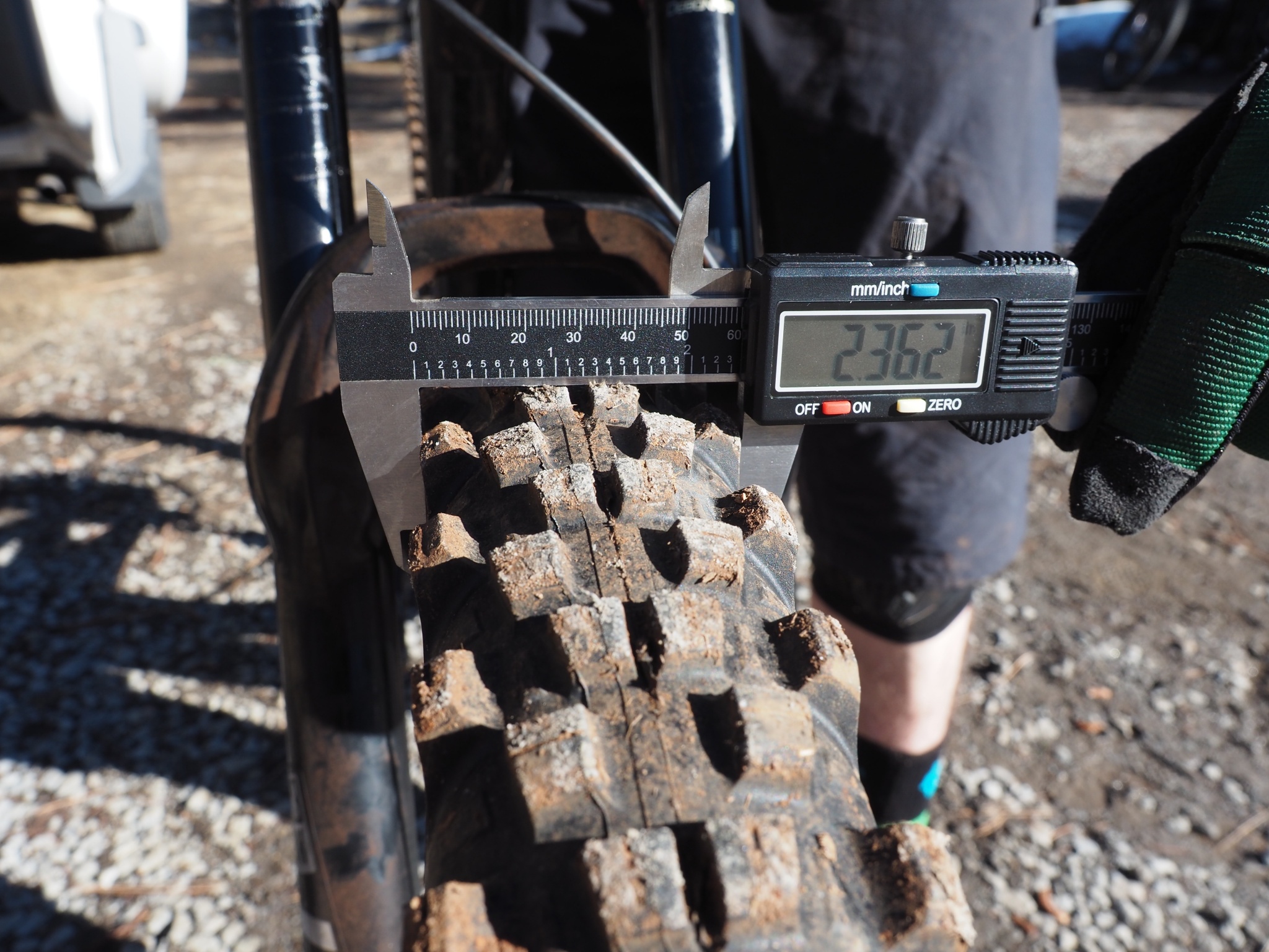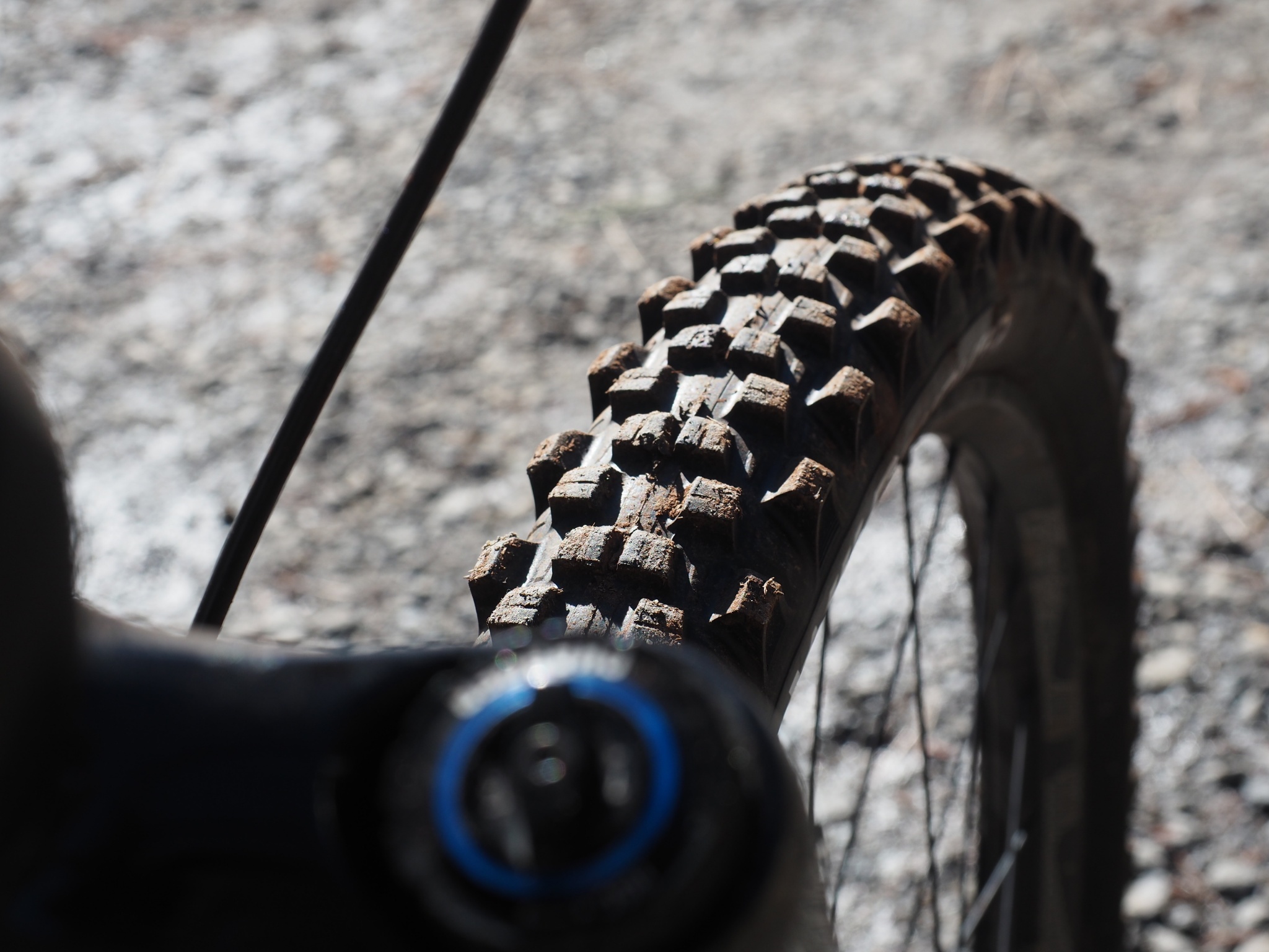 If you look at the shoulder knobs, you will notice they are very tall and relatively spaced out. This spacing allows each lug to really bite into the ground, its also beneficial for shedding mud. Each lug is set in the same position, they do not alternate like many other tires. Each shoulder knob has a vertical sipe in it that allows the rubber to conform to the trail surface. When you are in the saddle looking down towards your front wheel, the tire's square profile is noticeable. This isn't the most square tire we have ridden, but it is on that end of the spectrum