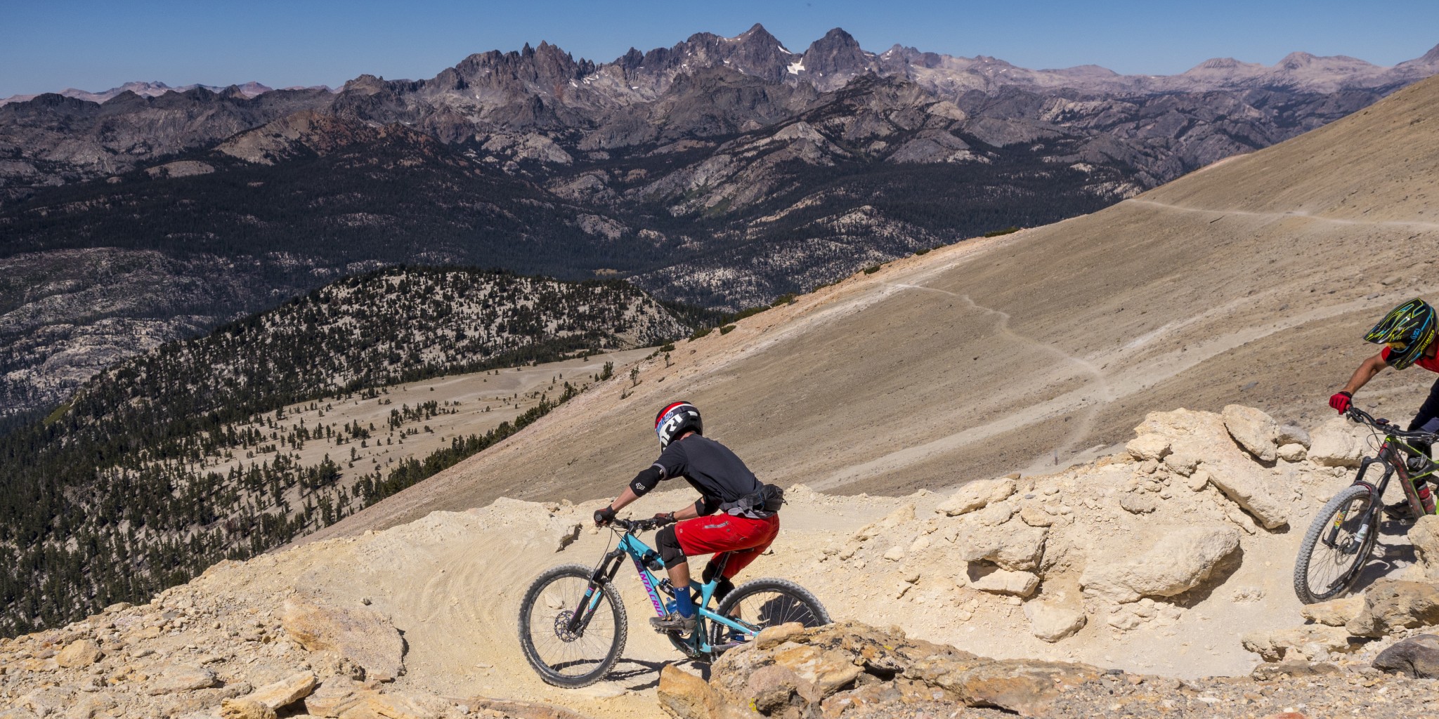 A short, ludicrously scenic trail follows the ridge behind the gondola building before dropping into a series of snaky switchbacks with lightning fast straightaways connecting them as they slither down the mountain's backside. Signs reading “no pumice riding” remind riders to stay on the trail and not bomb fall-line through the very light and porous volcanic rock found in abundance here. Just as we reach top speed, we're forced to reign things in for the upcoming switchback that will send us darting back across the hillside with more spectacular vistas of the jagged Minarets.