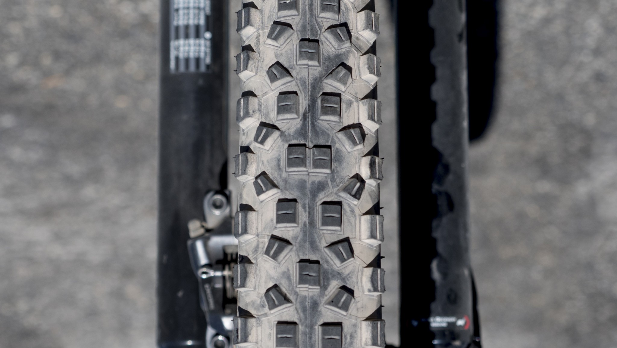What set this tire apart from the rest of the pack is its even cornering feel. Knobs are spaced across the tire so that there are no gaps or channels like many other tires we tested. The center tread is a three-row-wide pattern of alternating, siped, blocky knobs. There is a lone center knob, two that straddle the midline, and two more that creep towards the transitional zone. Trapezoidal knobs are placed at an angle in the transition zone, which lead to larger, aggressive shoulder lugs. The knobs get progressively taller as you work away from the 3-mm center knobs, to the 4-mm transitional knobs, to 6-mm on the edges. The symmetrical tread pattern allows the tire to be run in either direction.