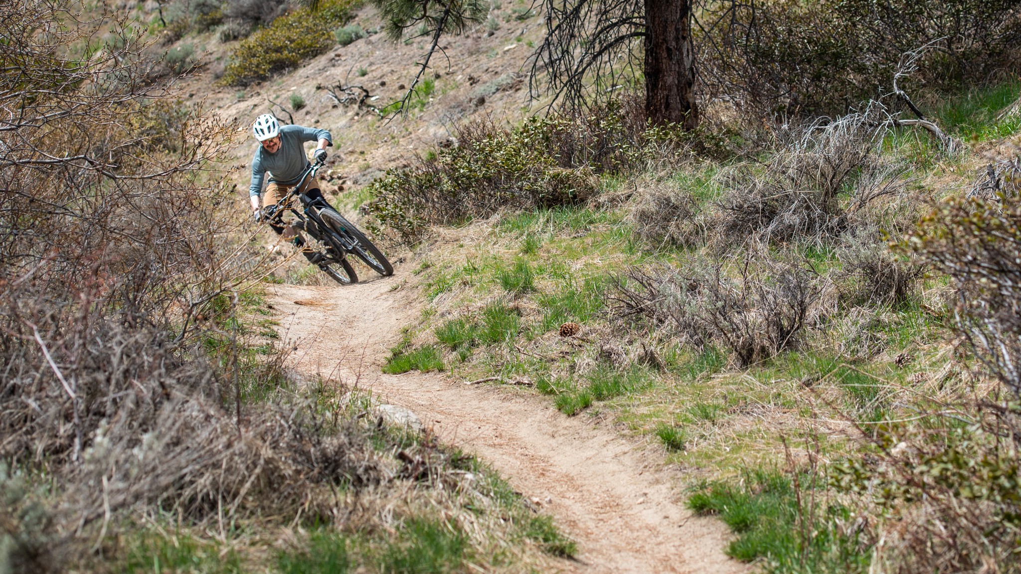 Due to the moderate length wheelbase and 66.9-degree head tube angle, the Jeffsy handles well on the climbs. It responds well to steering input and can tackle sharp uphill switchbacks and technical sections of climbing quite well. There's plenty of range offered by the NX Eagle drivetrain even with its 34-tooth chainring, though if your typical rides have lots of steep climbing you may want to install a smaller size. You may notice the weight of this bike if you're tackling some longer climbs, and we suggest using the compression damping switch for extended periods of paved or fire road climbing. We typically left the shock in the open setting while climbing on trails as it is quite supportive and helps to maintain traction.