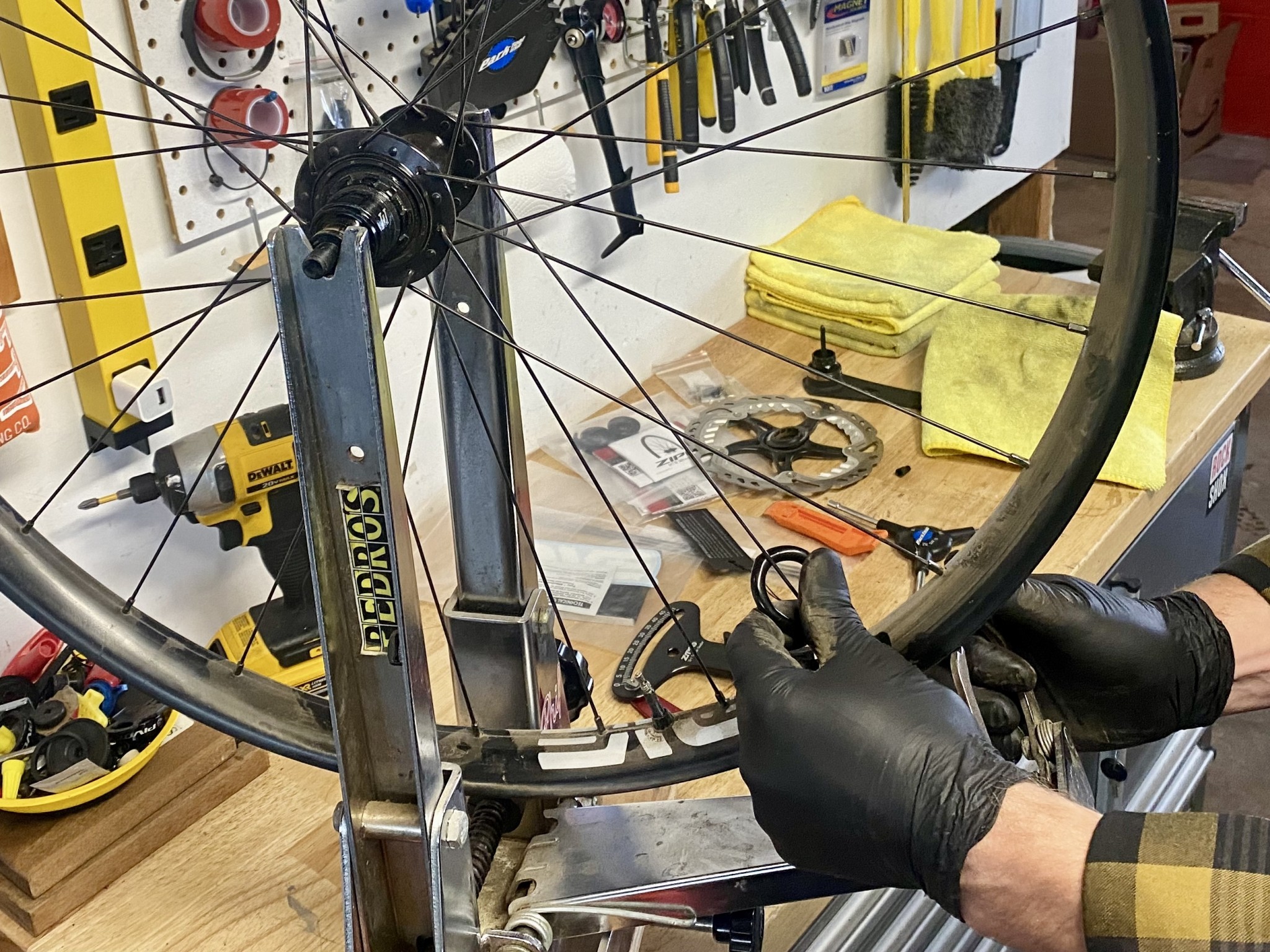 Front and rear were mounted with Maxxis Minion DHF/DHR Tires at 23 and 25 psi, respectively. The pressure was ideal for traction and fast corners but low enough that the rims bottomed out on trail features on more than several occasions. At the end of the test, we pulled the tires and put them in the truing stand to find that they had survived unscathed. The wheels are still true, bead surface is unfazed but the rims got a bit scratched up, as did the stickers. Spoke tension is almost identical to our readings before mounting tires and while they certainly look used, they're structurally perfect.