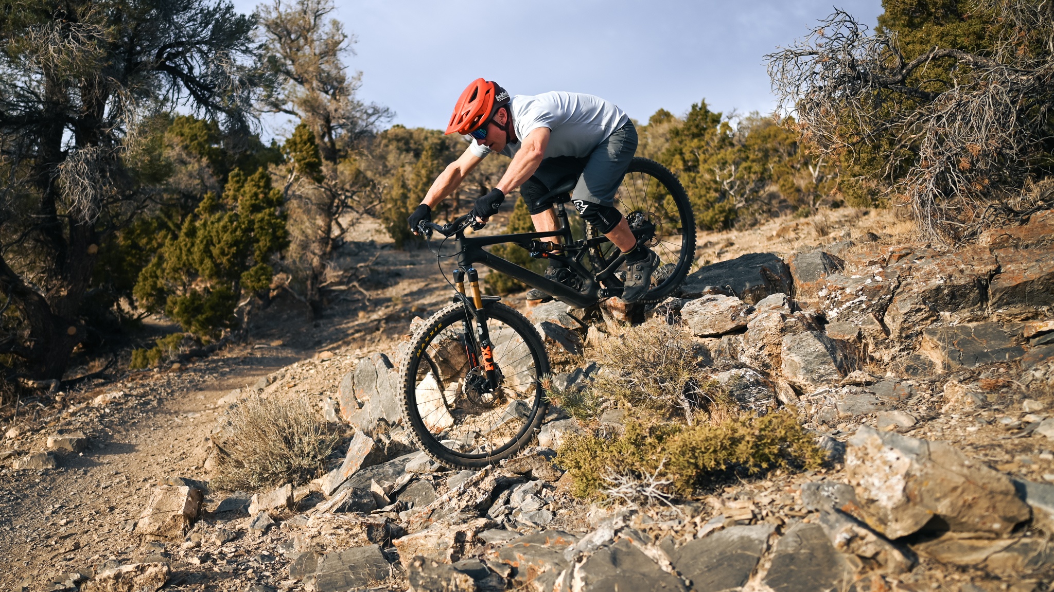 Our testing included plenty of high-speed rock gardens, some considerable drops to flat, and no shortage of rowdy side hits. We rode them with abandon through the Sierras, the high desert, and some nasty days on “trails in progress”. They were mounted with Maxxis Minion DHF/DHR Tires at 23 and 25 psi respectively. Our main tester weighs 175 lbs with gear and felt this pressure was ideal for traction and footprint and just low enough that the rims still found the trail on occasion.