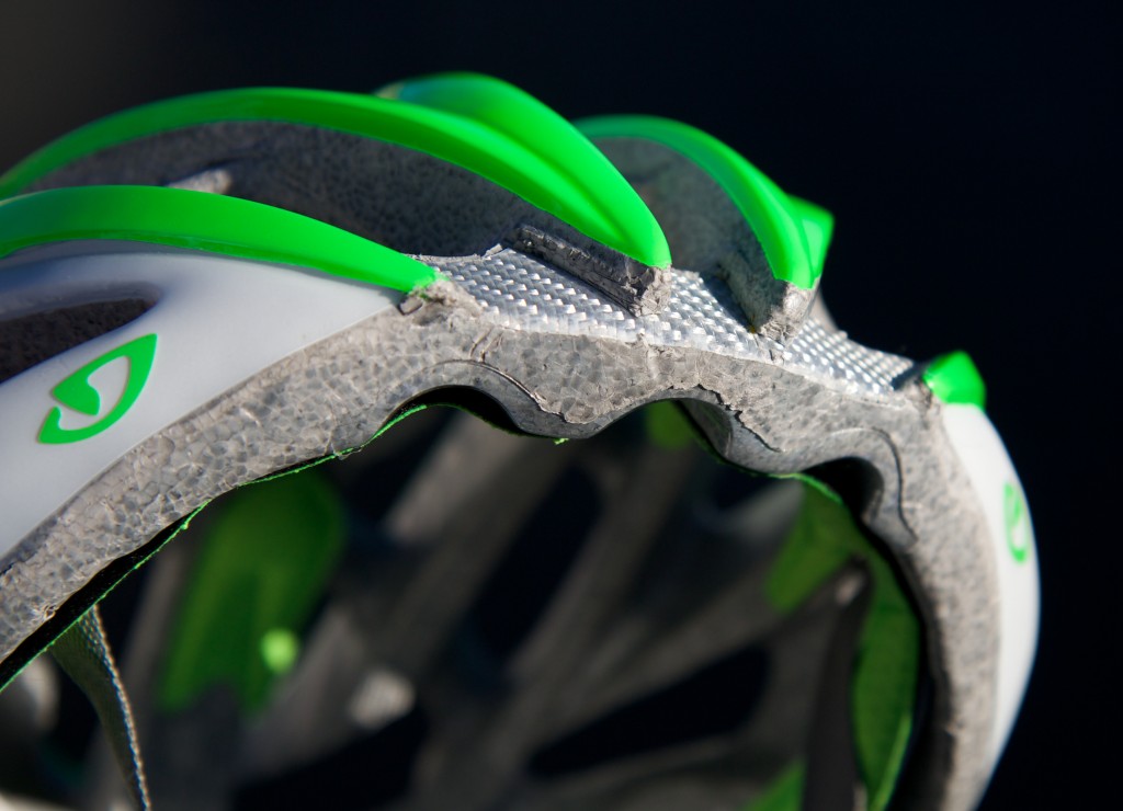 The Atmos' most vulnerable section is the lower edge of the polystyrene which is left exposed by the very minimal polycarbonate shell. Our test helmet sustained significant dents and dings to the lower edge during our test. The worst area was the pointy sections of foam at the front of the helmet which began to chip off just from daily use. The Giro Aeon has similar points molded into the front of the helmet but does a much better job of protecting the delicate polystyrene by covering it in shell material.