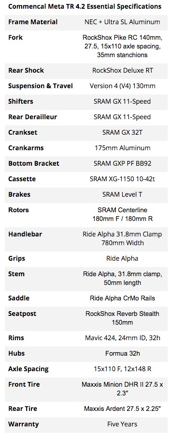 On a tight budget? The Meta TR 4.2 Origin is the entry-level model. The Origin retails for $2,549 (sells for $2,299) and is powered by a SRAM NX 1x11 drivetrain. Suspension is provided by a slimmer RockShox Revelation fork and the same Deluxe RT shock found on our test bike.