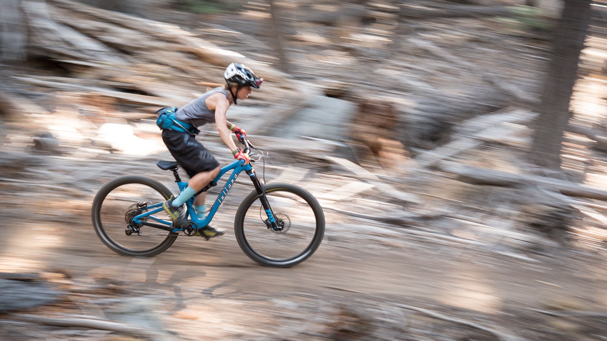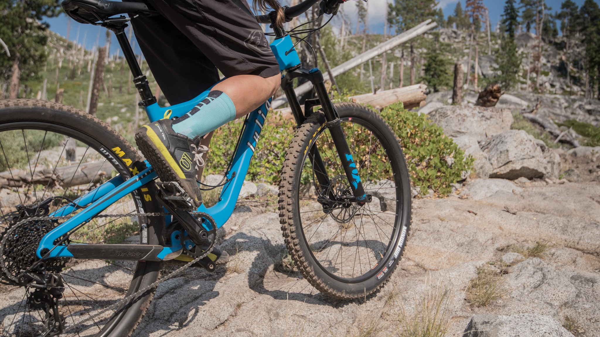 The fork and shock work in concert with the VPP suspension to keep the bike balanced and responsive over big and small features alike. The 130mm Fox Rhythm 34 fork is a solid performer and dynamic enough for even an advanced rider to appreciate. The Fox Float Performance DPS rear shock is reliable but feels stiff on descents. It's not harsh, but it doesn't offer a plush ride either. We would love to try out a cushier, higher-end version on this bike. The lighter, women's specific shock tunes worked well for our testers. We found it easier to dial in fork and shock pressures to allow for active suspension early in the stroke with plenty of reserve for the bigger hits. Santa Cruz bikes come with a medium/medium shock tune. Juliana sends theirs out with a light/light.