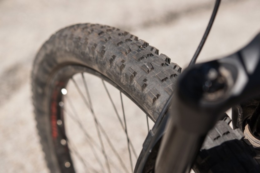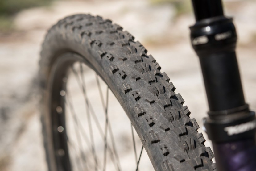 This bike is fitted with a Maxxis Minion DHF 29 x 2.3" front tire. We at OutdoorGearLab are huge fans of the DHF. However, we would like to see the 2.5-inch version on the front of this rig. The Maxxis Ardent rear tire is sloppy and offers little traction and poor bite when braking. This tire has no place on a trail bike and should be reserved strictly for the pure cross-country application.