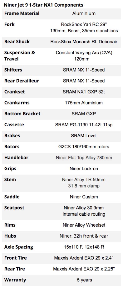 Note: While the Jet 9 1 Star NX1 is 27.5+ compatible, Niner only sells a 29er complete build.