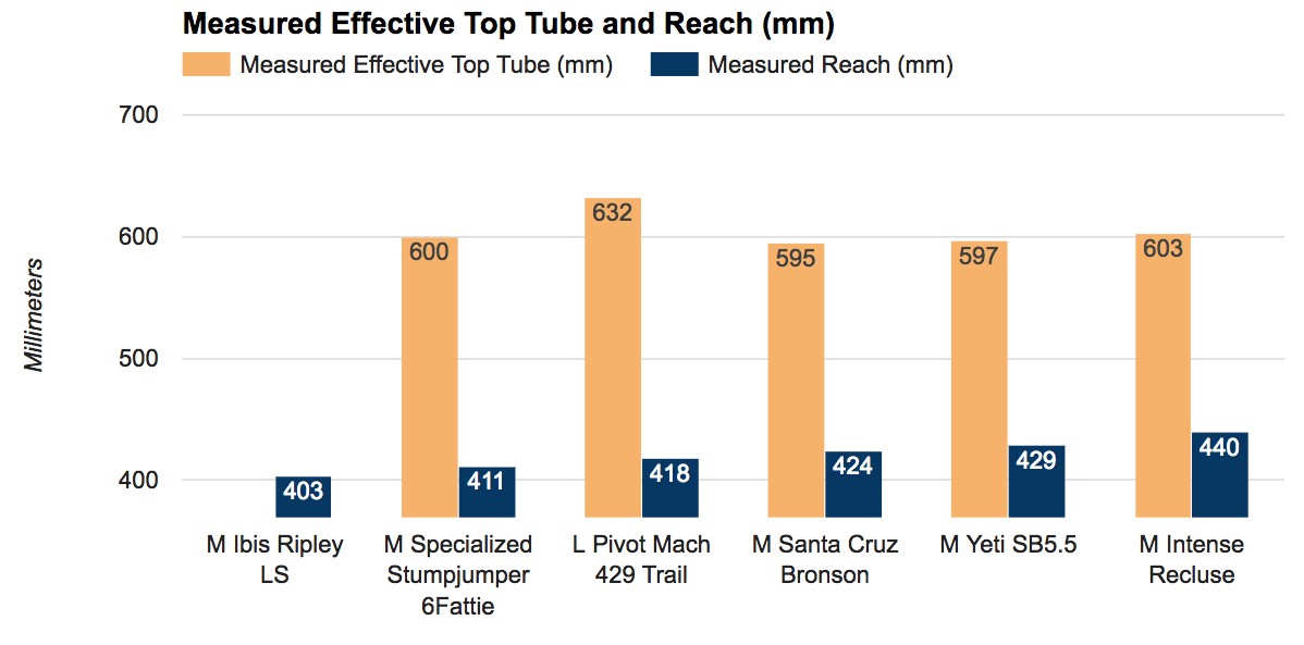 When the bikes are organized in order of reach length, the Pivot Mach 429 Trail is in the middle of the pack. However, it's effective top tube length is the longest in the test. (Measurements by OutdoorGearLab. Read about our methods in How We Test). Credit: Clark Tate