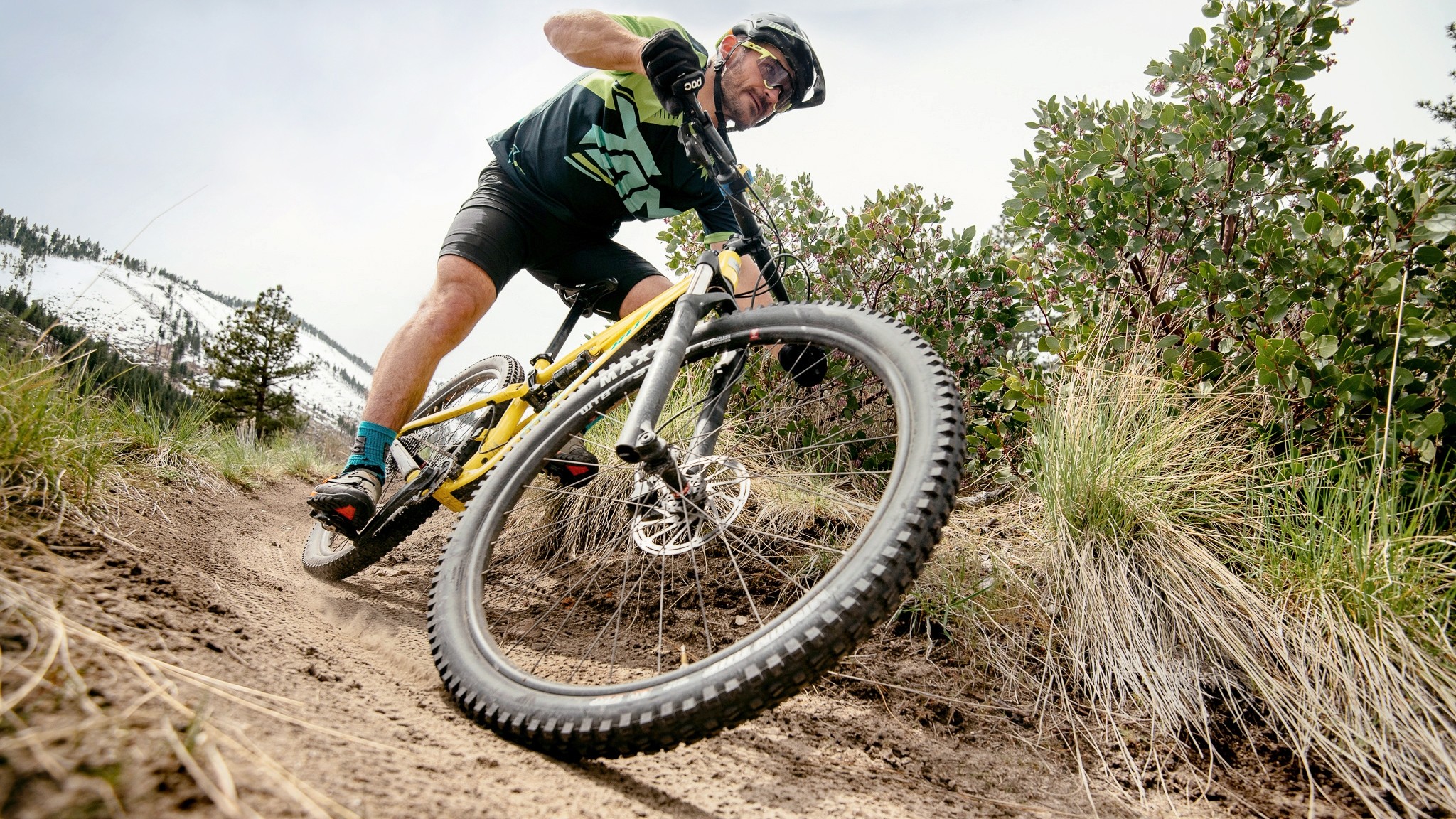 The Maxxis Minion DHF 29 x 2.3" mounted up front provides excellent bite and is an overwhelming favorite amongst OutdoorGearLab testers. The fast rolling Maxxis Crossmark rear tire is questionable on climbs and could prove troublesome in wet conditions. The Crossmark is an obvious and relatively inexpensive component to swap out.