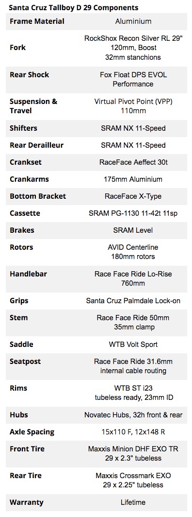 We tested the Tallboy Aluminum D build which rolls in at a $2,699. Santa Cruz offers plenty of build kits to address rider needs.