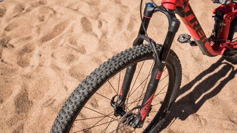 We don't want to beat a dead horse, but the Bontrager XR3 tires are a serious strike against the Fuel EX. We find that the tires offer limited corner control. The round design of the “shoulder” knobs didn't clearly define the breakaway of the tires. Testers have to be careful to not lay the bike over past the washout zone as the tire doesn't provide proper warning. The narrower bars mounted to the Fuel didn't jump out at our testers as a serious issue. That being said, cornering abilities would only improve with a wider bar.