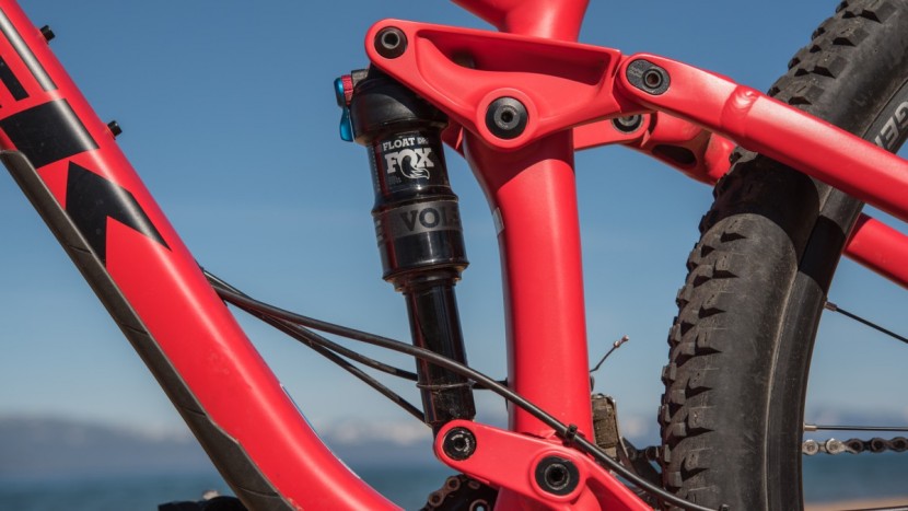 The Fuel EX utilizes Trek's Active Braking Pivot (ABP) suspension design. ABP suspension features a pivot point at the rear axle, which allows the suspension to move freely regardless of braking forces. The shock is mounted to the rocker link and is completely independent of the front triangle. This system is not known to be the most progressive, meaning it reacts similarly to small bumps and bigger, harder hits. More progressive air shocks, which ramp up as they move through their stroke, help combat this shortcoming.