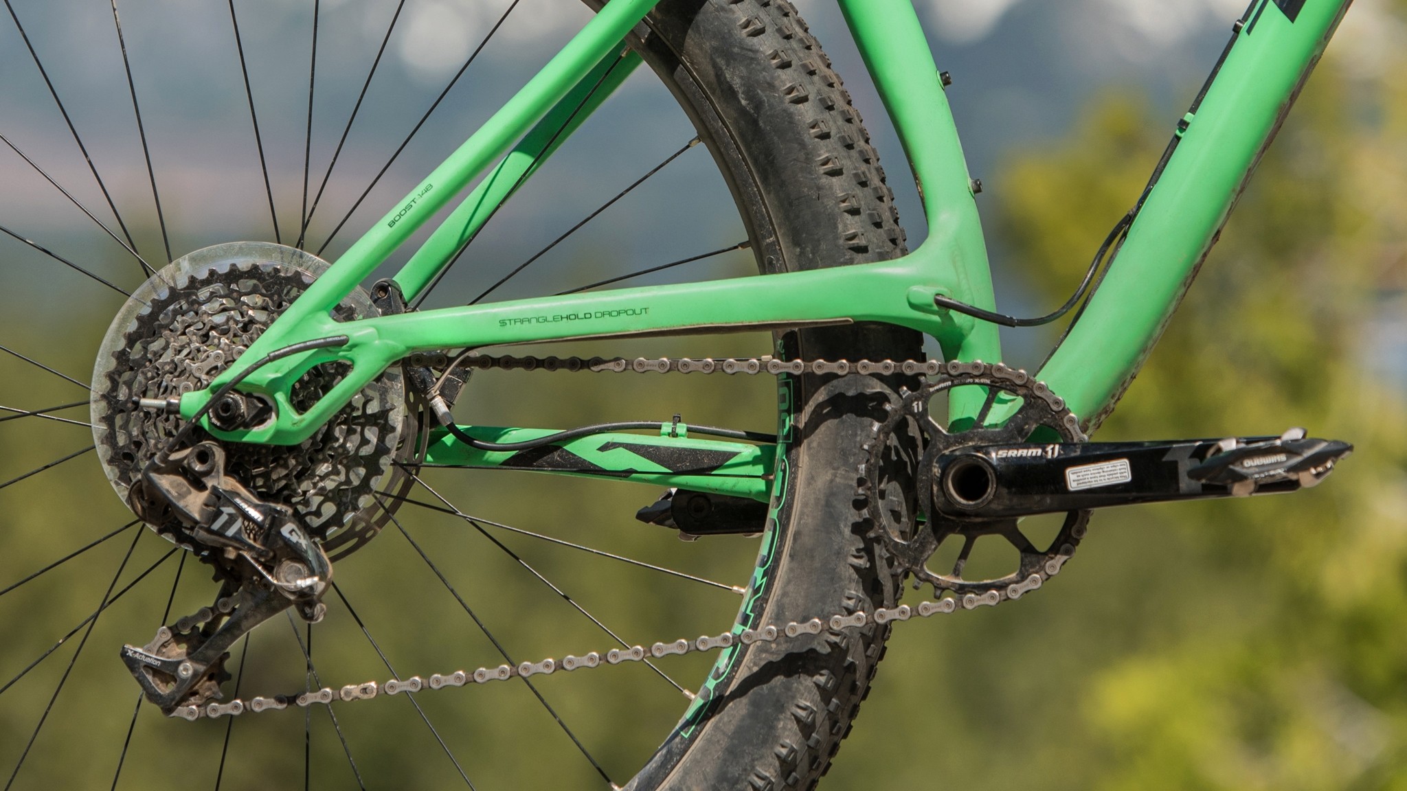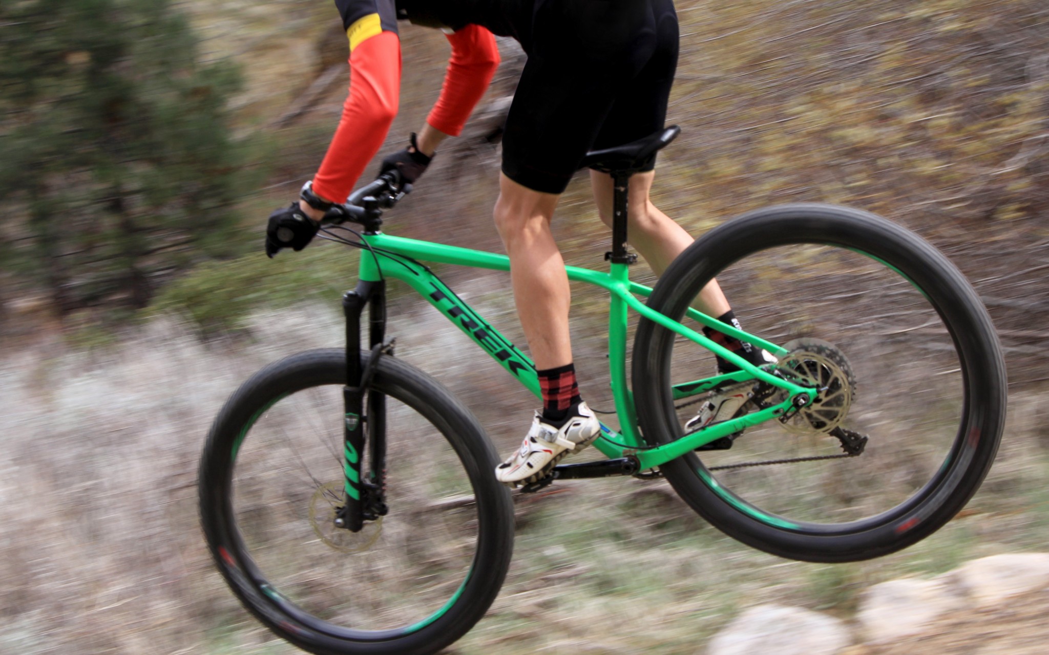 Wheels and Tires — The Bontrager Chupacabra 29 x 3" tires are wrapped around massive 46mm inner width rims. They don't lack any traction. The 28 wheel spokes seem light for such massive wheels. The tires might absorb enough impact to shield the wheel from any excessive beatings, and we didn't notice any flex, but we'd like the assurance a few more spokes would provide.
