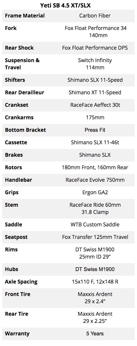 The Yeti SB4.5 has been discontinued. It has been replaced with the SB130 which has more travel and slacker angles. We hope to review the new bike in the coming monthes.