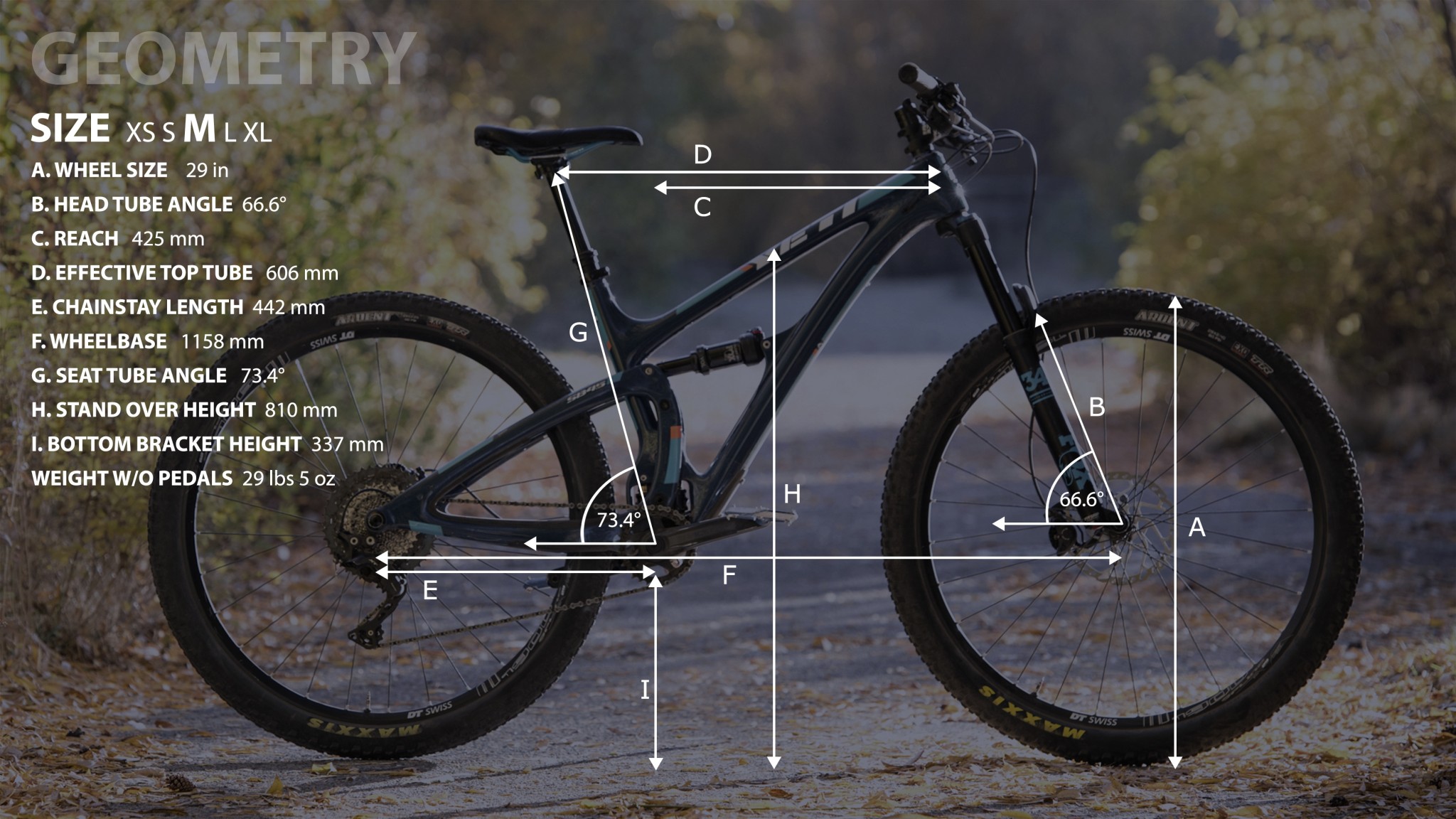 We took some time to measure our medium SB4.5. A 66.6-degree head tube angle met with a 606mm effective top tube and 442mm chainstays to create a 1158mm wheelbase. The 73.4-degree seat tube angle is relatively slack but put you in a nice position over the 337mm high bottom bracket. The Yeti hit the scale at 29 lbs 5 ounces. This made it the lightest bike in our test ever-so-slightly edging out the Ibis Ripley LS.