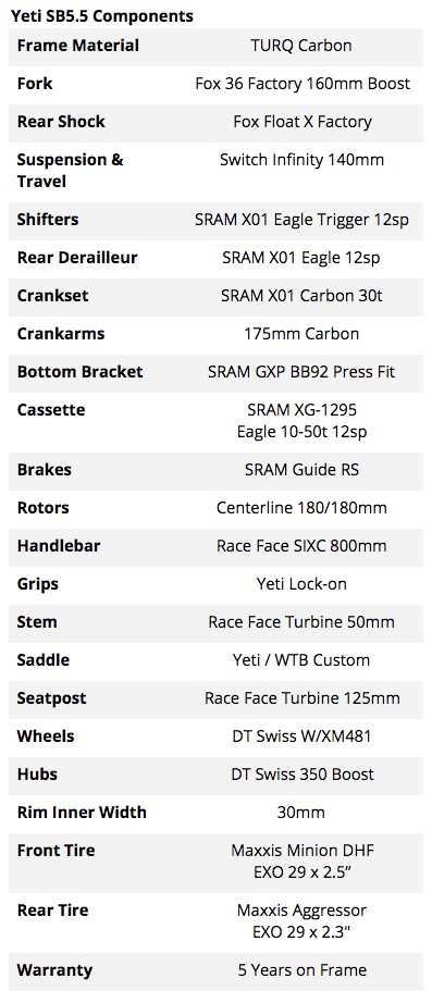 The SB5.5's frame is great, the tires are stellar, the 35 x 800mm handlebar is burly and appropriate for the bike, but the rebound adjustment on the rear shock is ridiculously located, hard to reach even with the tools you need to adjust it, and the RC breaks Are disappointing on such an expensive build.
