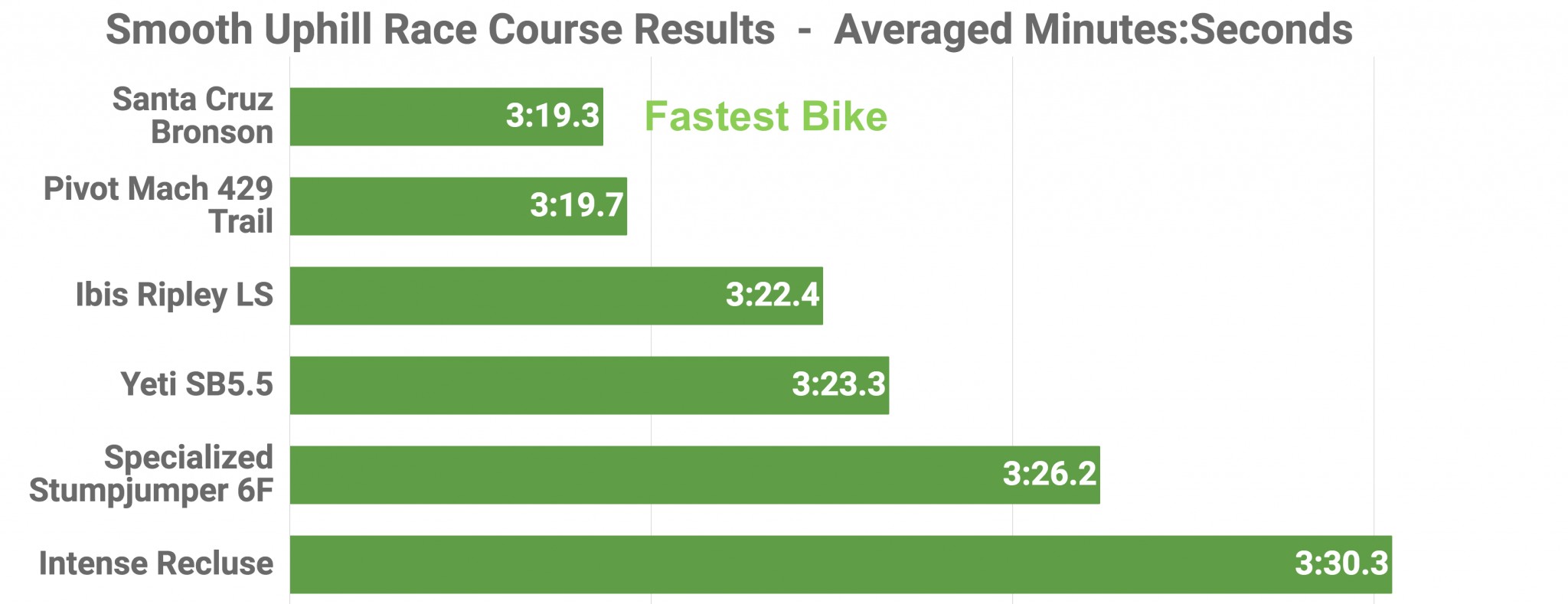The Yeti beat the second place Ripley LS by 0.9 seconds. These two 29ers won the day due to their tons-o-traction tires and confidence inspiring handling. The Santa Cruz Bronson falls 4 seconds behind the SB5.5 on average. It requires more aggressive handling at speed and just couldn't catch the rollout speed of those 29er wheels.