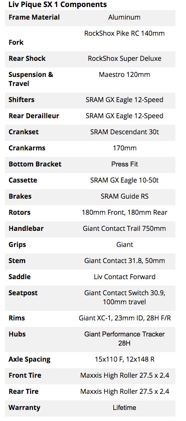 Liv doesn't offer any other build options on the 2018 Pique SX other than the 1 we tested. The 2018 Pique Advanced and 2018 Pique share a frame, which differs from the 2018 Pique SX we tested. The Pique SX has a slacker head tube angle, by 3-degrees, and a slightly slacker seat tube angle, longer top tube, shorter reach, and longer wheelbase. Both the Pique Advanced and Pique have 130mm of travel up front to the Pique SX's 140mm. All of this makes the SX more downhill friendly while the other bikes in the Pique line favor the climb and fall in line with more cross-country style riding.