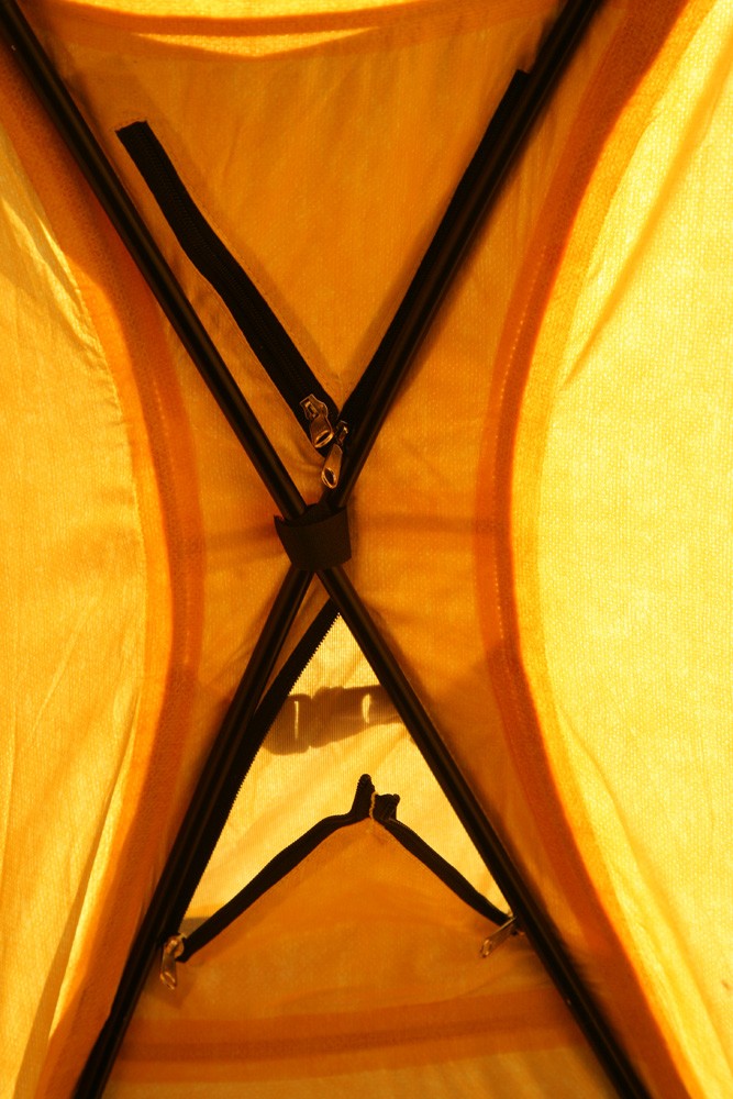 The Eldorado pitches from the inside, with the ends of the poles inserting into reinforced corners. The poles themselves settle tightly into the corners of the tent, and plastic twist ties wrap around the poles, keeping them in place. The advantage of this set-up is that the poles are well supported by the walls. During times of strong winds or heavy snow loads, the weight is evenly distributed along the length of the pole. This design is one of the key foundations attributing to the strength of this tent, which has been tested time-and-time again on expeditions.