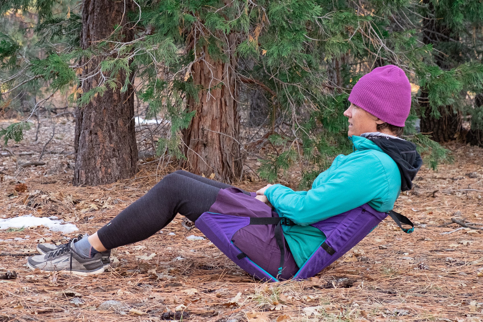 Weighing in at 24 ounces on our scale, the Original Crazy Creek is one of the lighter models we tested, in line with the other taco-style chairs. Although the weight is low, this chair is too stiff to roll, so it has to be strapped to the back of your pack in its full square format. That makes it easy to remove and grab a seat on quick breaks, but it's a bit annoying having a large piece of foam flopping around on your pack, potentially getting snagged in dense brush.