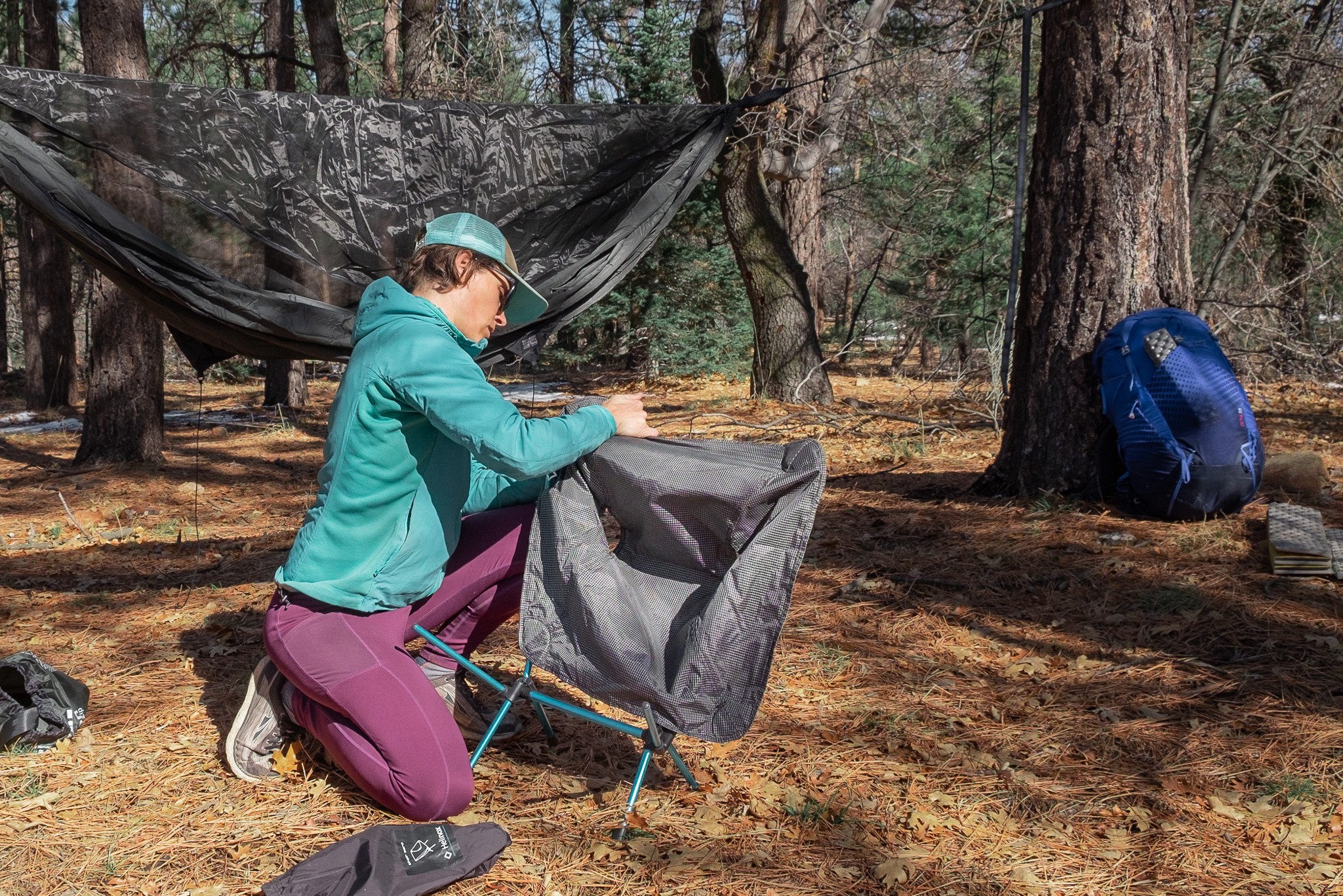 It doesn't get much easier than a bold arrow that says “THIS SIDE UP” unless you also print picture and text directions on the chair. Helinox has dummy-proofed the setup of this model… almost. Because the logo is along one side of the chair material, rather than at the top, we attached the fabric upside down — more than once.