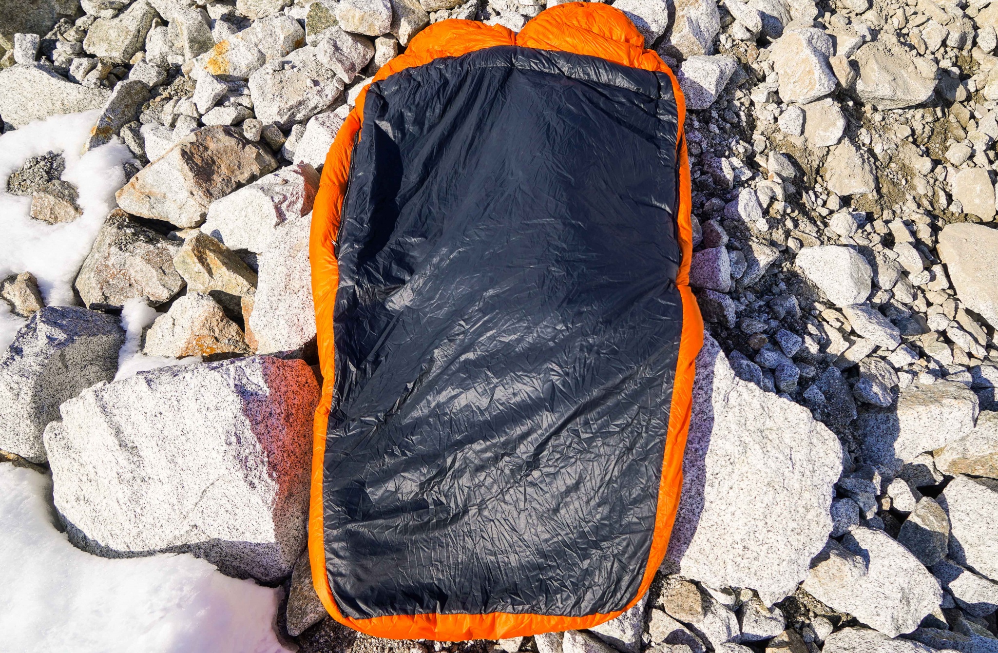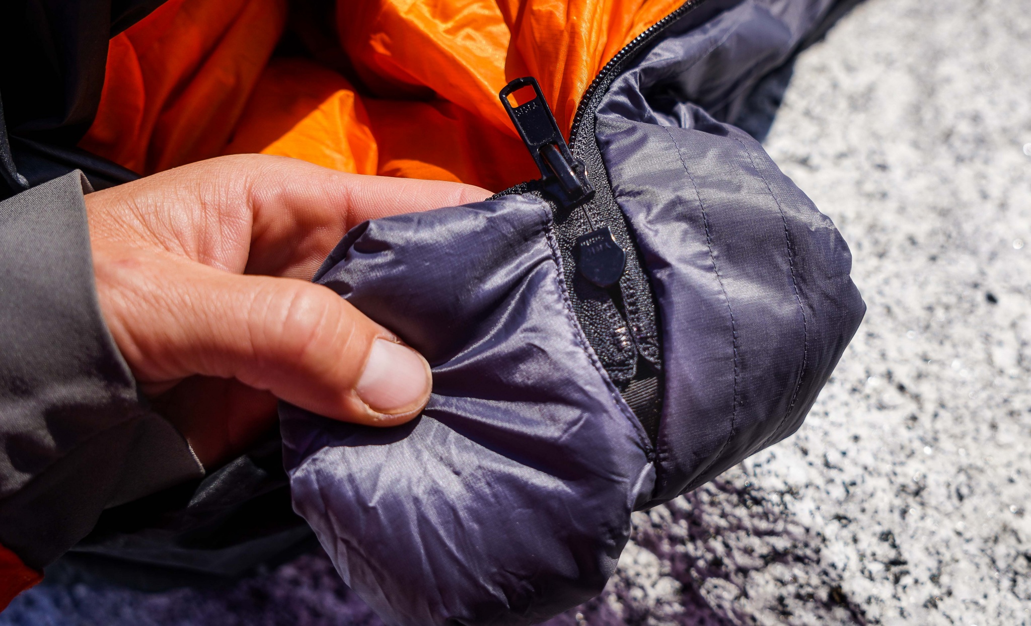 We like the feel of the zippers and their ability to avoid snagging. However, we harbor a huge durability concern about how the bases of the zippers are stopped off and sewn into the bag. Most sleeping bag zippers include a pair of separating pins that can be utilized for restarting the zipper slide if the teeth become misaligned. With the zipper ends sewn into the Spoonbill, a quick realignment is not possible. Fixing misaligned teeth would likely require removing the zipper completely from the bag and sewing it back on. Fortunately, we didn't have any misalignments occur in the backcountry with this bag, but we have with other similarly flawed designs and the frigid night that followed was extremely unpleasant.