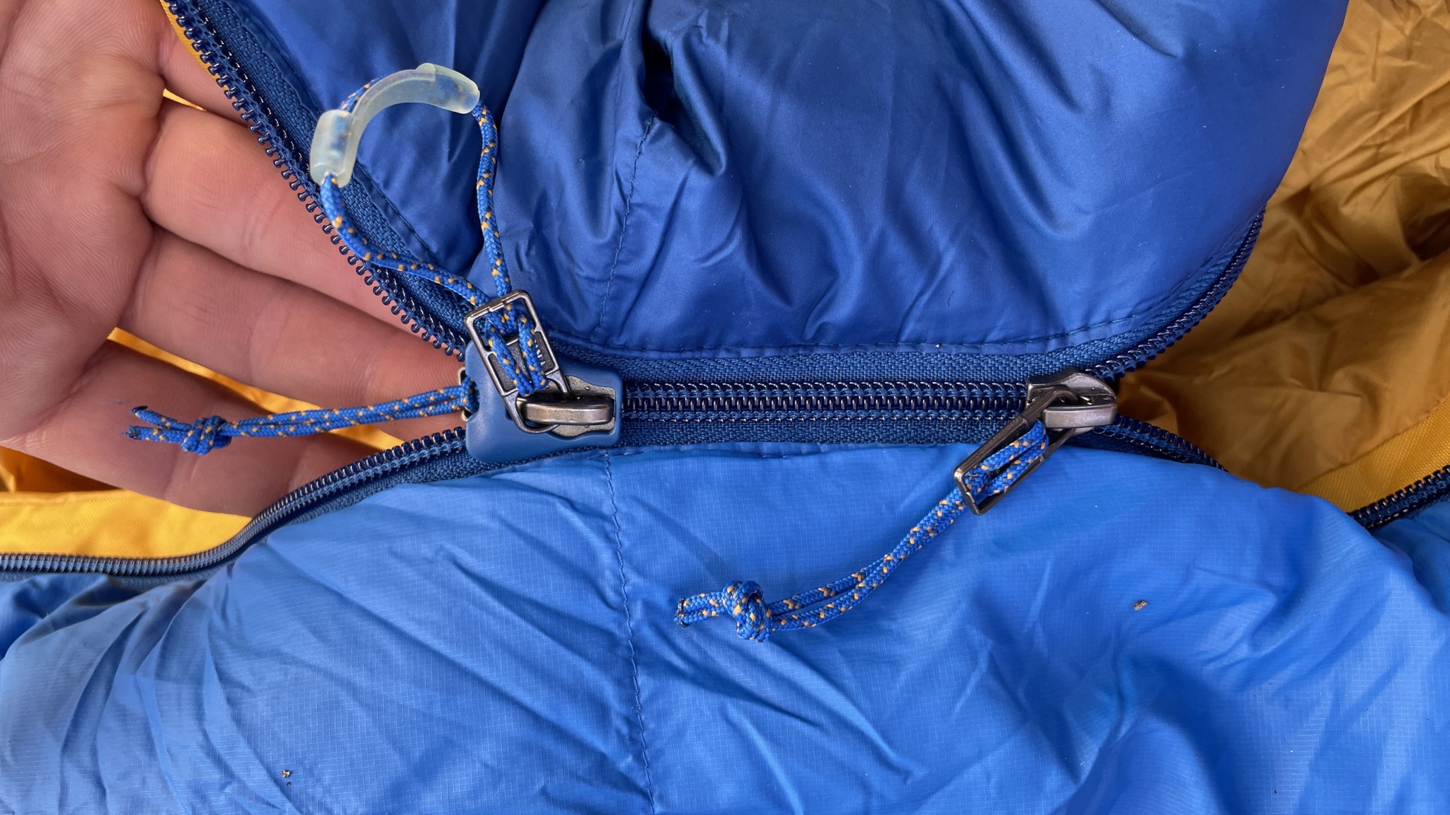First up is the zipper. The upper slider is designed to reduce snags. It has a glow-in-the-dark zipper pull, a nice touch we wish every bag had. The lower slider also has a zipper pull, another nice touch. Furthermore, the zipper itself is almost full length, which is nice for both venting our feet and opening the bag up all the way and using it like a quilt. One thing we really like about this bag is the light-colored interior. The inside of the bag is yellow. This brighter color makes it easier to find anything you bring into the bag with you, as opposed to the black hole interiors of most of the competition.