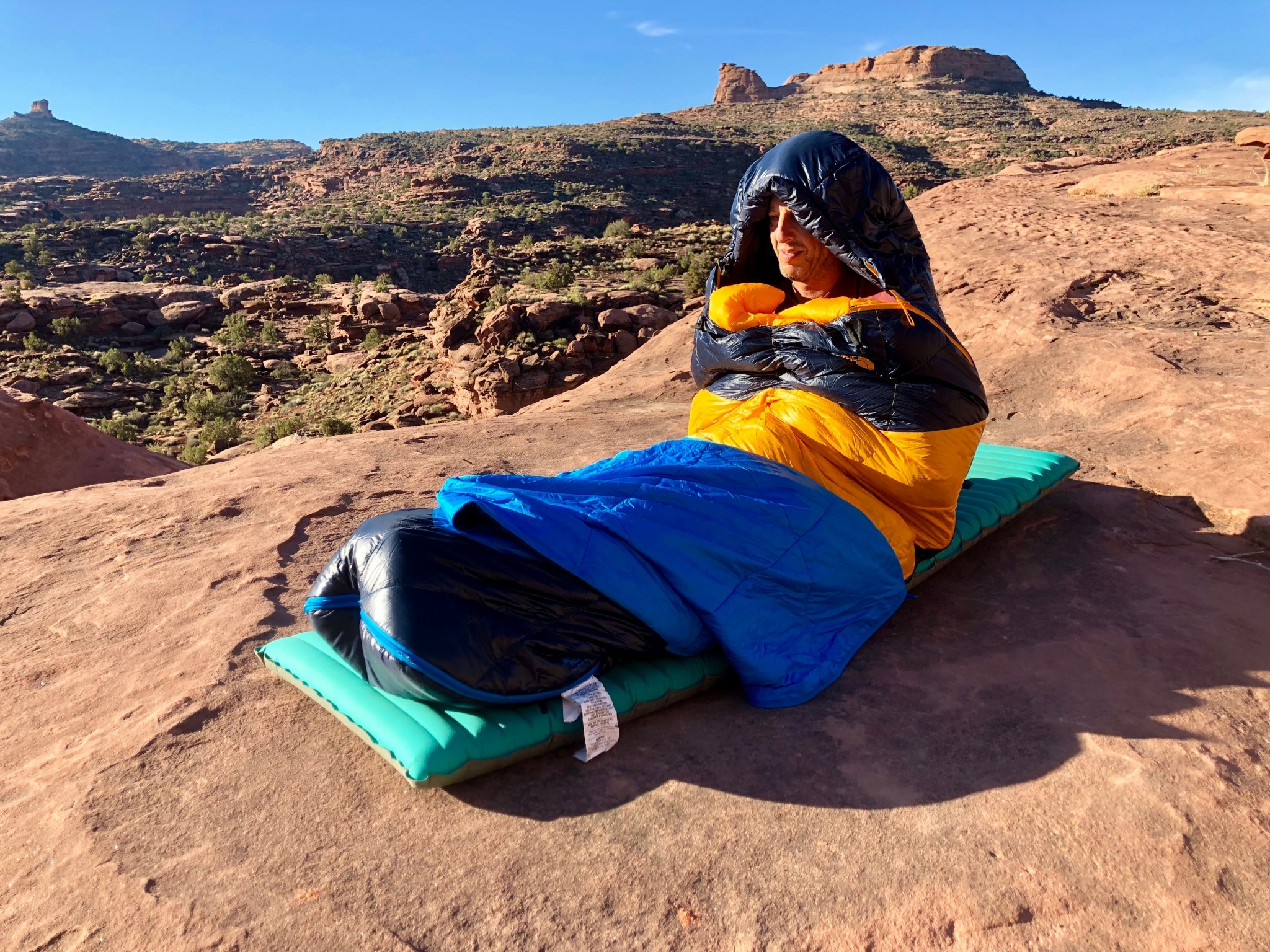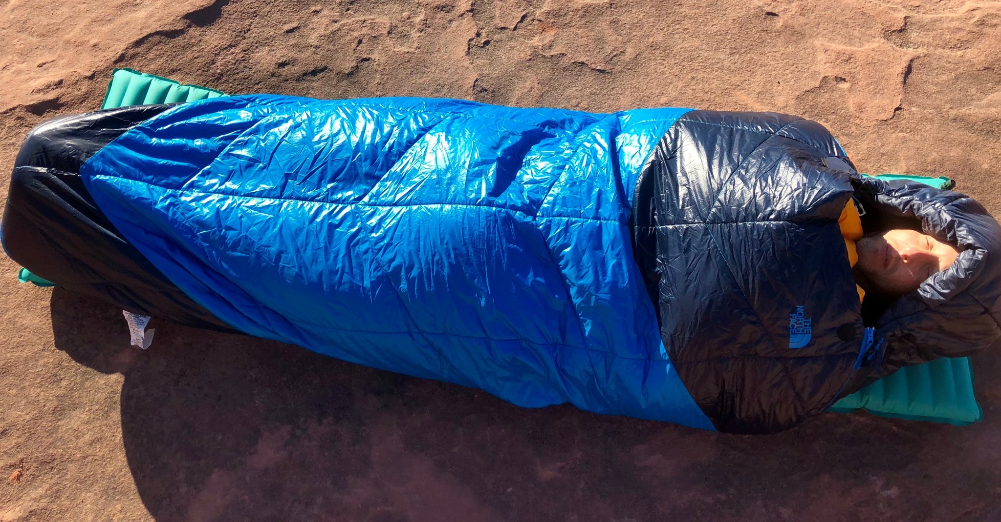 The One sleeping bag has three total temperature ratings, one for each potential configuration. The North Face claims a 40°F rating for just the thinner blue layer, a 20°F rating for just the thicker down layer, and a 5°F for both the yellow and blue layers zipped to the lower layer.