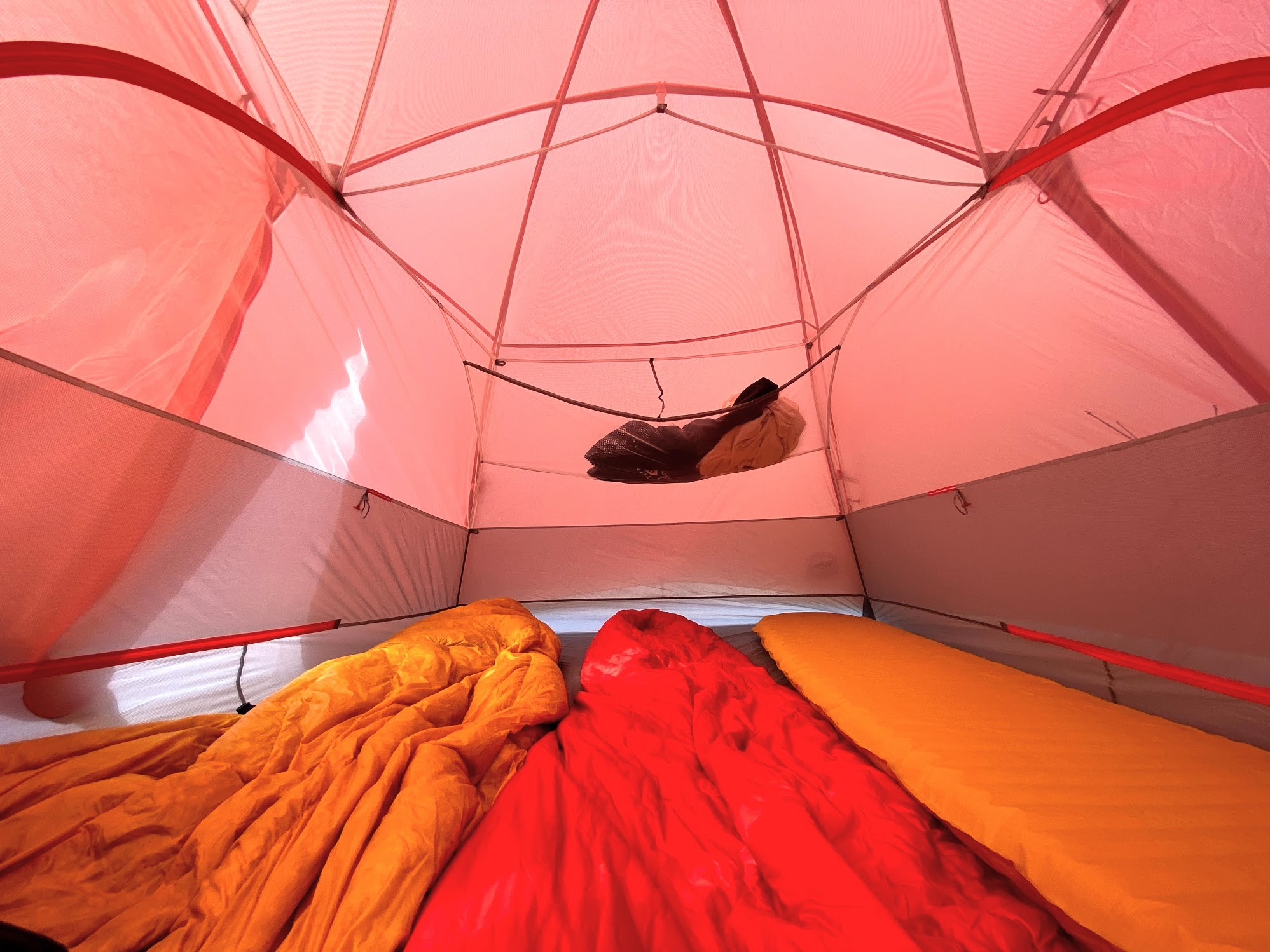 This geometry serves to save weight and keep the tent feeling roomy without sacrificing the more crucial head-and-shoulder space. In the two-person version, it's a real asset, reducing overall weight without diminishing the function of the interior volume. However, you notice the narrower dimensions more with three people, and it makes it nearly impossible for the middle person to sleep head-to-toe.