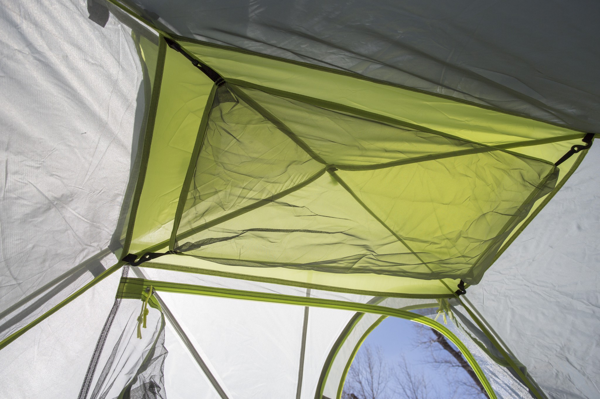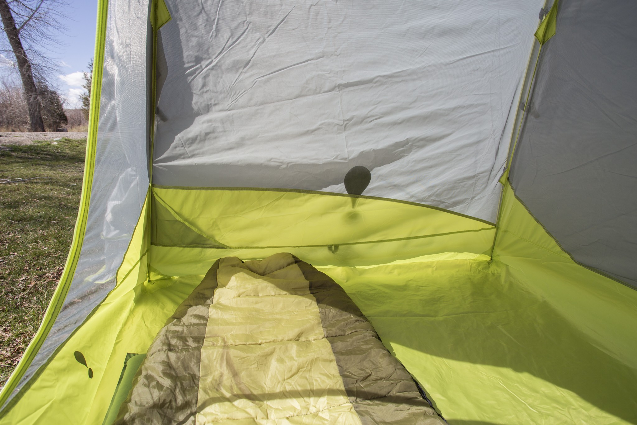 Inside, we enjoyed the roomy 12" x 25" gear loft and two additional pockets; while in other tents we tested we were left looking for sunglasses/ phone/headlamp storage, we felt contentedly organized in the Midori. Ample mesh on the walls and a hooded vent on the fly gave us plenty of fresh airflow. We felt the absence of a second door and vestibule, however, for the simple convenience of not having to crawl over each other for middle-of-the-night bathroom breaks.