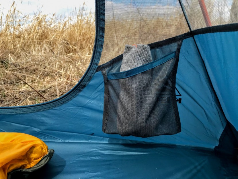 We found that the vestibules provided ample storage space for a pack and footwear. The pockets on the inside are modest. Each side has a small one, and there is a slightly larger one overhead.