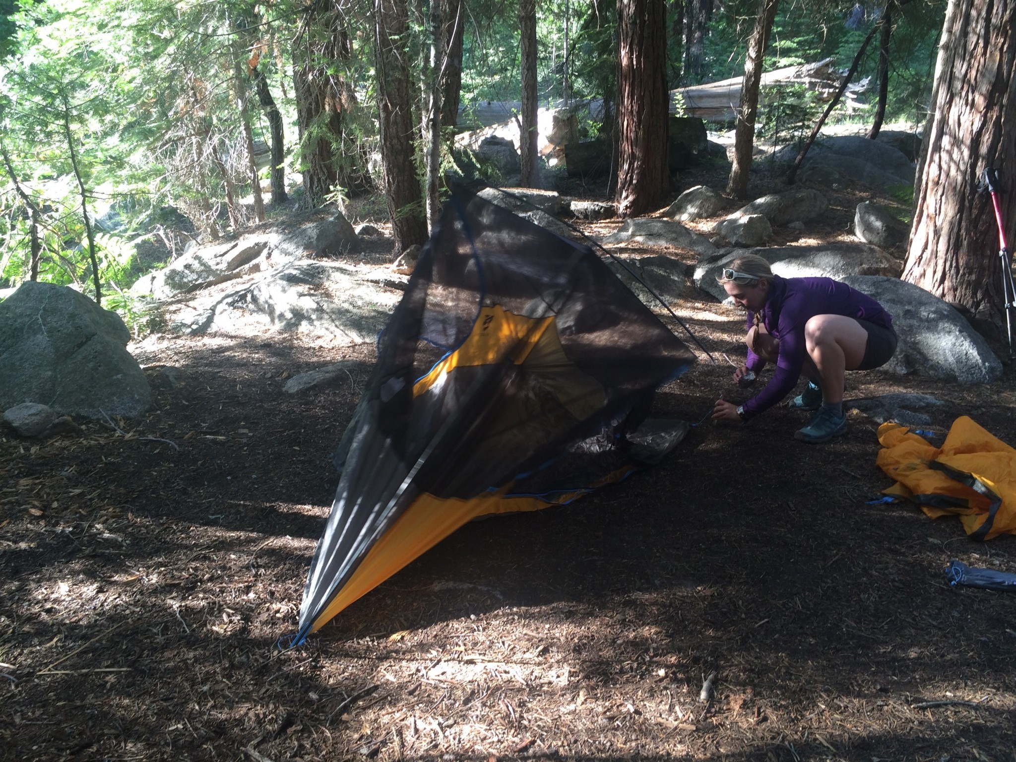 The tent wants to trick you into thinking that it is freestanding, but it sets up a little bit strange if you stake it out after putting the poles in. Since it is not entirely free-standing, it takes a bit of practice to get the setup right. We recommend staking it out first, minding square corners, then putting the poles into the body. The pole construction is similar to the Double Rainbow's, though the way the fly is designed to fit onto the body makes the tent look a bit odd and jaunty. But rest assured — it's probably set up right.