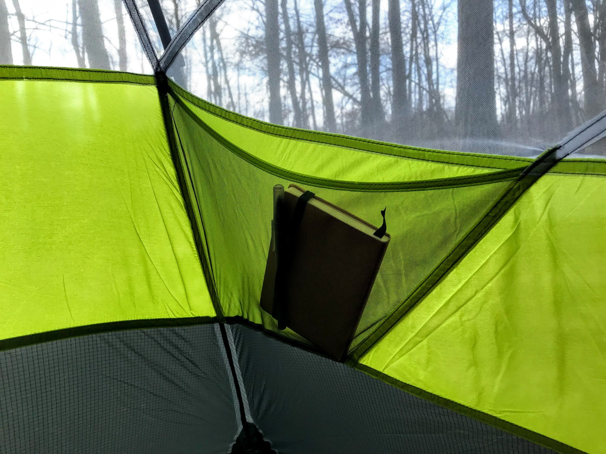 The trapezoidal vestibules are enormous, each offering ample space for gear storage. When tucked inside, the two mesh pockets (one at each end) provide enough space for a book or a few articles of clothing. Like its sibling, the award-winning NEMO Dragonfly, the Dagger includes overhead light diffuser pockets which are made from opaque white fabric that creates a soft glow from the light of a headlamp.