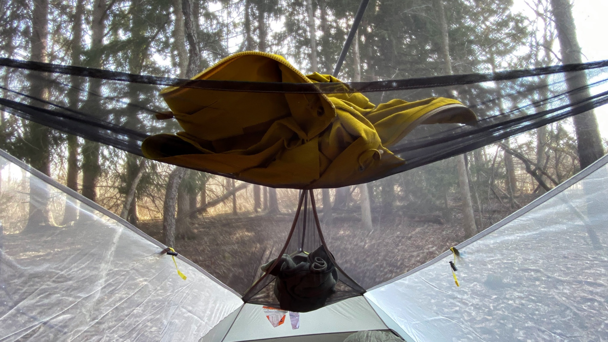 The showstopper of this tent's comfort features is the storage pocket system. There are two massive mesh pockets — one at the foot and one overhead. We loved being able to stash bulky items like rain jackets up there to keep them accessible but out of the way. They also make great “drying racks” if you have some damp socks that need airing out. Each side has a small accessory pocket for a phone, glasses, or gloves, and there are two light pockets for a headlamp to cast overhead light at night.
