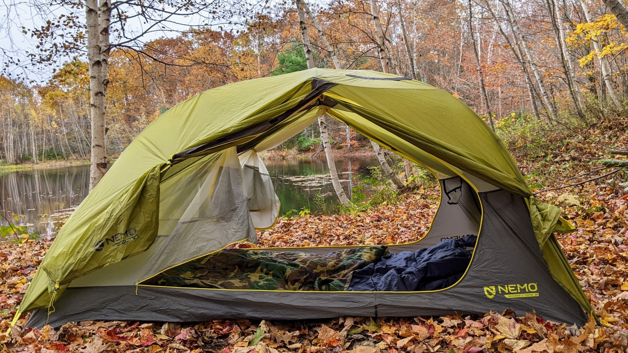 The Dragonfly uses a proprietary Osmo ripstop nylon fabric for the tent and fly. We were initially skeptical, but after testing, we noticed that the fly sagged less than other models with regular ripstop nylon. For anyone who has tried to enter or exit a tent on a rainy day and gotten soaked by a floppy fly, this is a noteworthy improvement in materials technology. The fly doors also have small built-in kickstand vents that are meant to facilitate airflow while keeping the fly mostly closed.