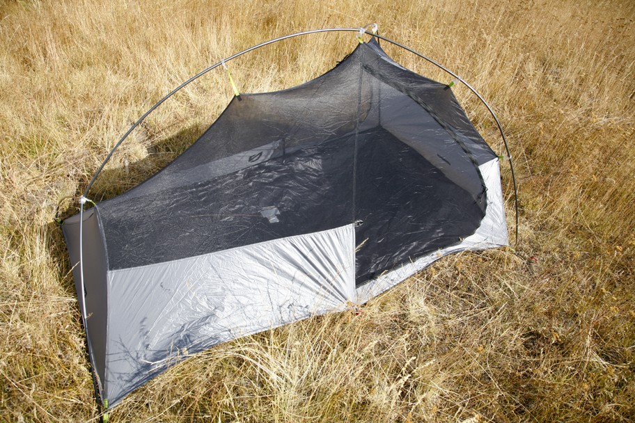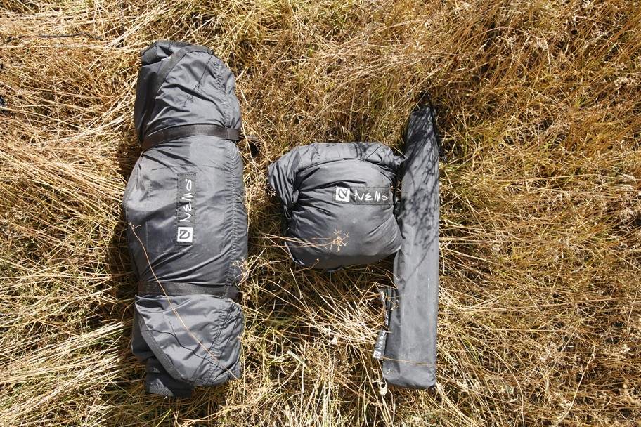 The Obi weighs just under 57 oz., or 3 lb. 9 oz., with stakes. In comparison, the lightest double wall tent tested weighs 24 ounces or 42 percent less than the Obi. The Obi comes with an alpine style stuff sack that separates the inner and outer tents from the pole, a design that we see more often with four-season single wall tents like the Mountain Hardwear Direkt2 and Black Diamond Firstlight. It's very good at compressing the tent body. Some companies such as Hilleberg and Warmlite argue that tents last longer when rolled up around the poles, but, as far as we know, there's little evidence to support that theory.
