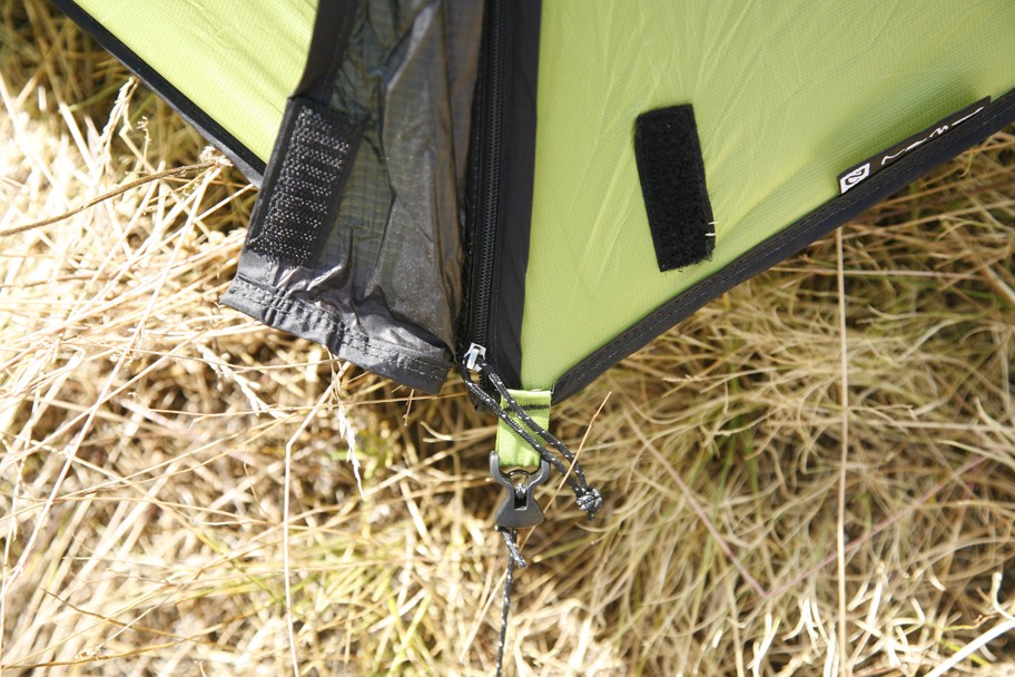 The Obi lacks a clip at the vestibule door. Adding one would help to relieve stress on the vestibule zipper. We don't believe that the Obi's use of DAC Jake's Feet on the four corners results in a net benefit. These are slightly easier to use but not as reliable as traditional grommets. See the photos below for details. It's also important to note that Nemo is the only company that we know of that allows you to swap out the bottom part of the Jake's Feet. This could be useful if one was to break, but we still prefer grommets.