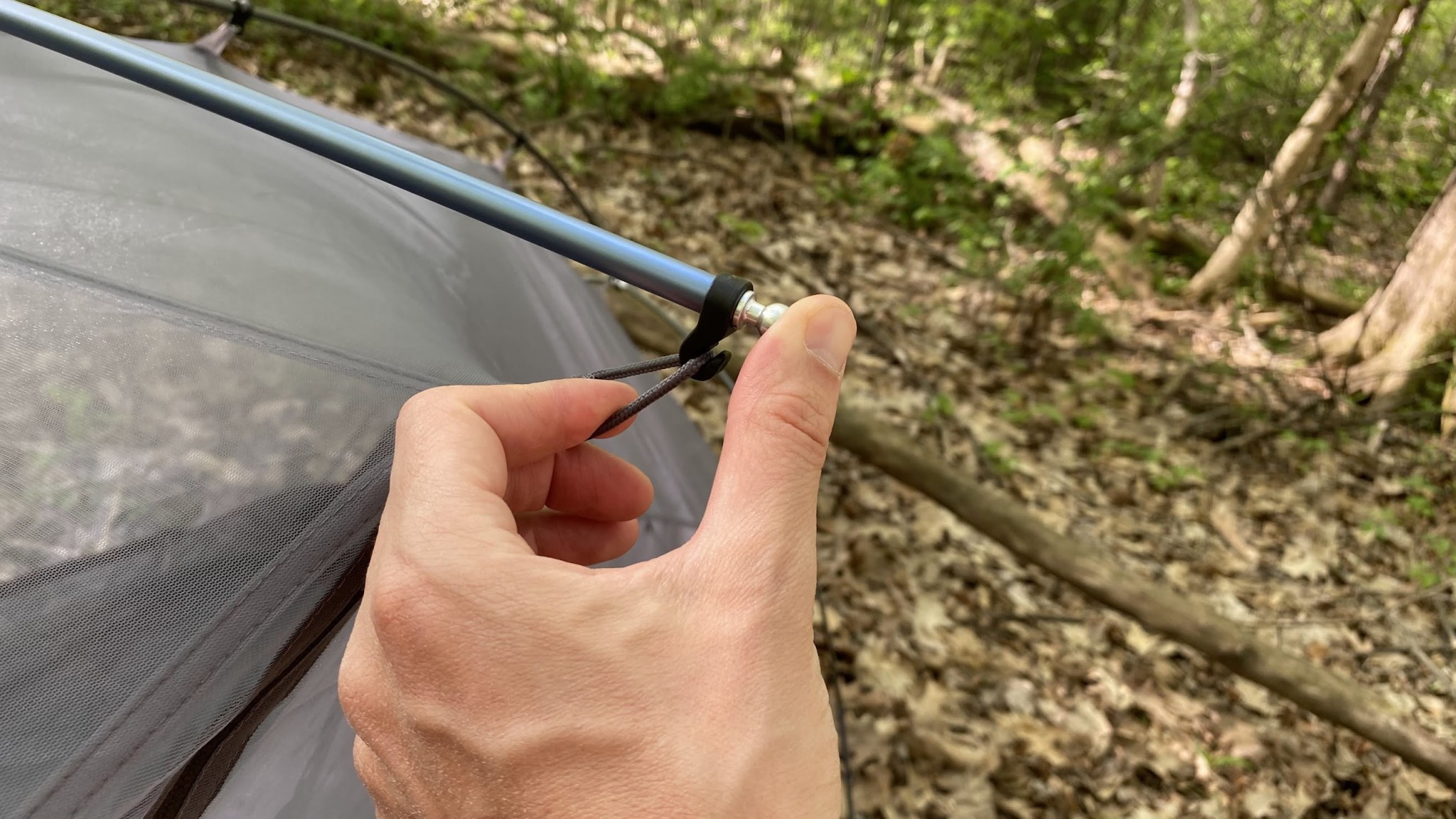 The fly fabric is a thinner 15D, and the floor is a slightly burlier 20D ripstop. These fabrics are more delicate. Without a footprint underneath, we expect that some pinholes will form on the floor of the tent, which usually happens when it is pitched repeatedly on abrasive, sandy surfaces. On the plus side, the pole pockets that attach the fly to the crossbar are especially durable rubber. The corner grommets and fly hardware are strong metal, and the tri-corner stakes are especially bend-resistant.