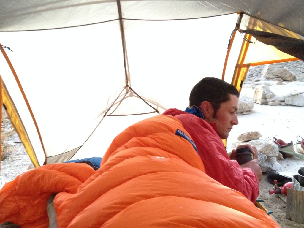 The tent is rather low profile, with a peak height of 39". The doors are low and difficult to get in and out of. The two zippers that create the triangle shape of the inner doors are somewhat annoying to do up because they get caught on the outside zipper cover. We prefer a door that has one D shaped entry and zipper like on the Mountainsmith Morrison 2. It requires less zipping and may disturb your partner less when you're getting out in the middle of the night.