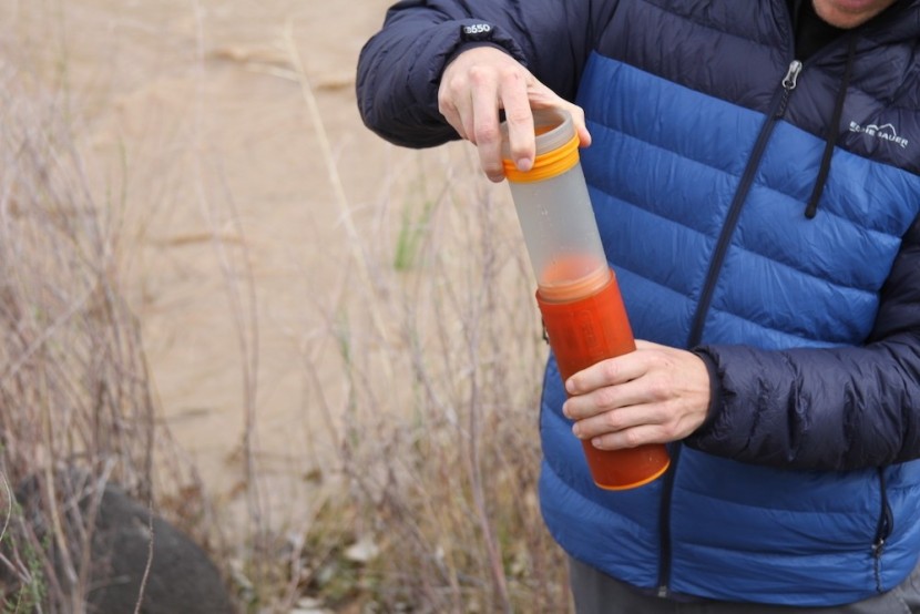 To press it down, you need to position your hands at the rim of the interior cylinder and press all of your weight onto your hands, slowly pushing the air out which also forces the water through the cartridge at the bottom. This leaves clean water in the interior cartridge. At the end of each filtration, our hands were left sore with imprints from pressing down on the lid. If you didn't have a solid surface to do this on (like in a canoe), it'd be difficult to filter. Overall, filtration is difficult and not our favorite.