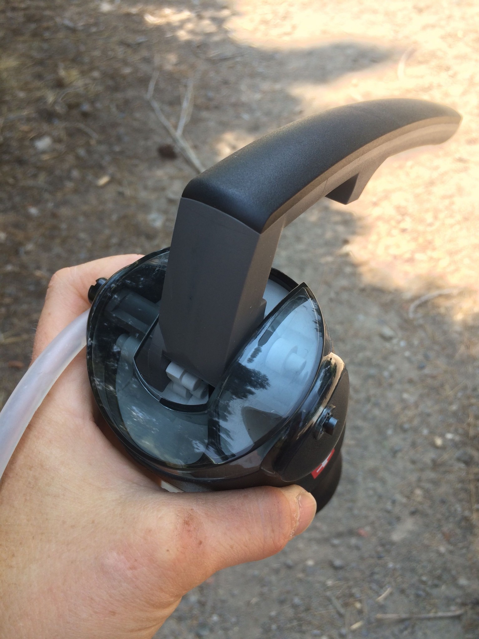 The Vario was the second fastest pump in this test, after the MSR Guardian. This filter has two speed settings; a slower one for “lifespan extending” which activates the ceramic disc as a pre-filter thus slowing down things a bit, or the fast output setting that does not use the pre filter — allowing the main glass fiber filter to get clogged faster, but has a higher flow. We tested the Vario in the lifespan setting and it still pumped out a liter of water in 47 seconds (and a mere 39 seconds on the faster flow setting).
