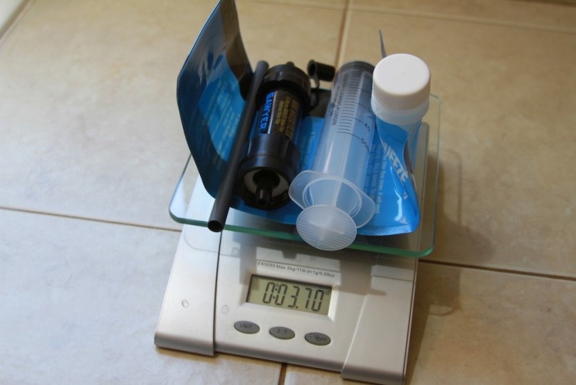 The kit with the 16-oz bag, straw, filter, and syringe weighs about 3.70 ounces. The filter weighs 1.80 ounces, making the system incredibly lightweight and packable. While we wish it came with a little carry pouch for all its contents, it fits nicely into a large ziplock bag. The thin profile makes it easy to carry while trail running or embarking on long missions.